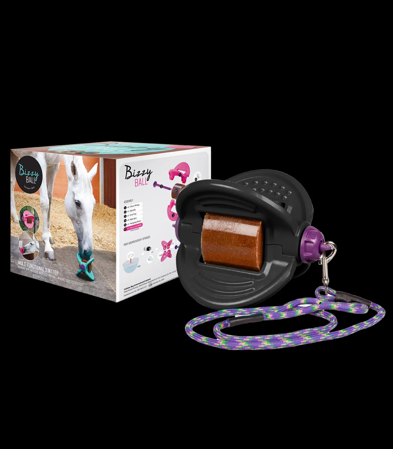 Der Bizzy Ball mit patentiertem Flügel-Design und den innovativen Aromatherapie-Schwämmen mit ätherischem Pfefferminzöl. Zur Verwendung auf dem Boden oder zur Aufhängung an einem starken Seil (nicht im Lieferumfang enthalten). Lieferung ohne Leckstein.