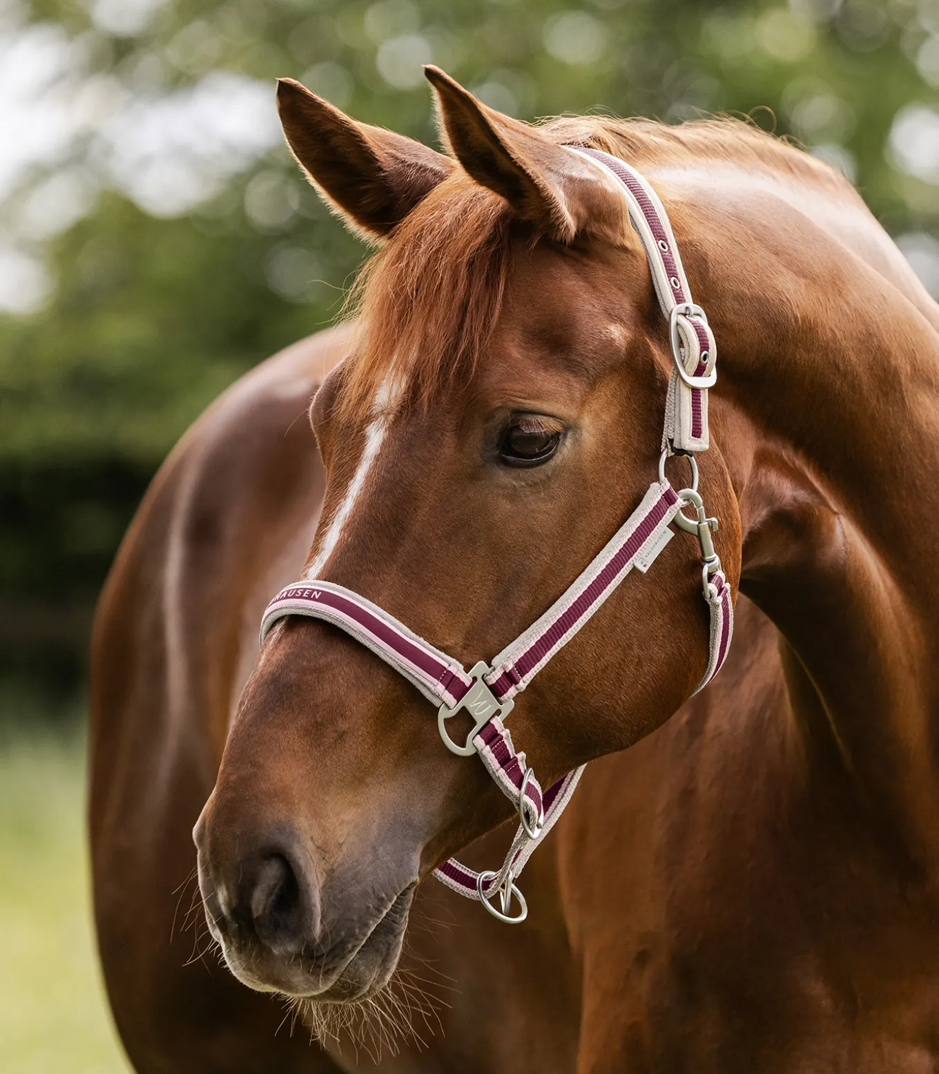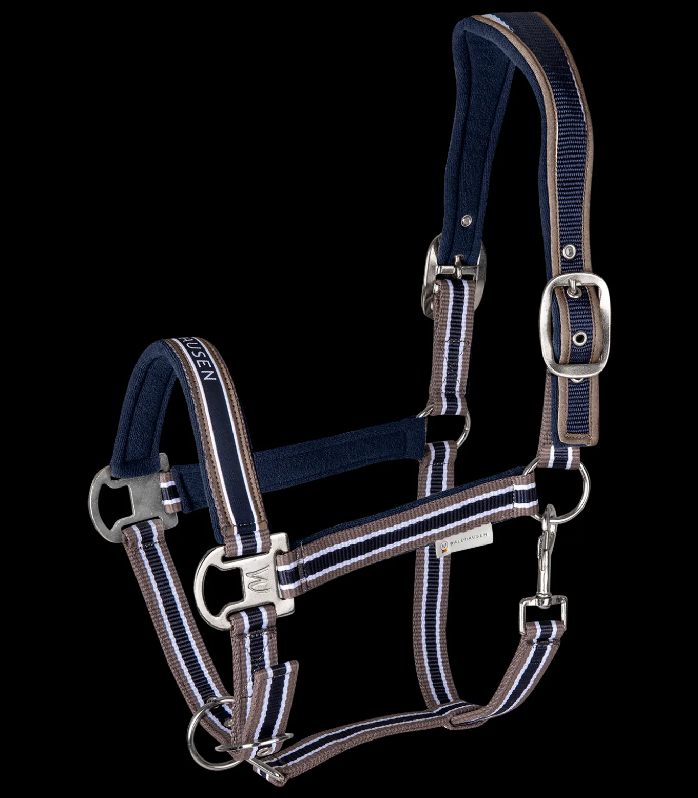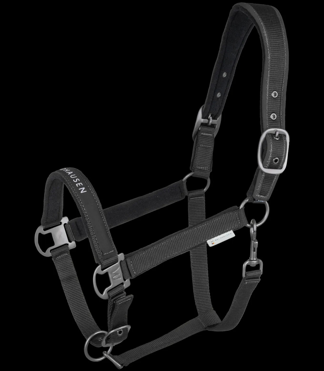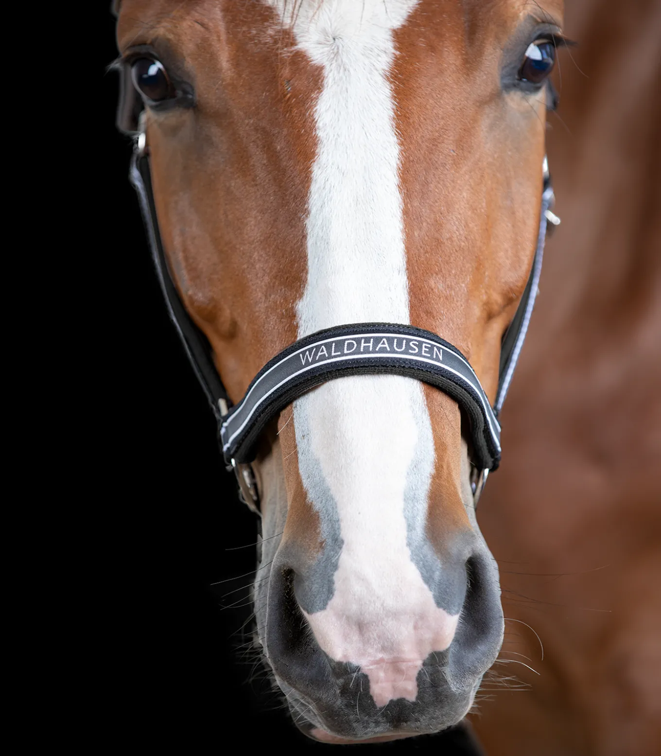 Hochwertiges Halfter mit weicher Polsterung im Nacken- und Nasenbereich, sowie an den Backenstücken. Anatomisches Genickstück für angenehmen Tragekomfort. Mehrfache Verstellbarkeit an Kinnriemen und Genickstück. Mit silber/grauen Metallbeschlägen.