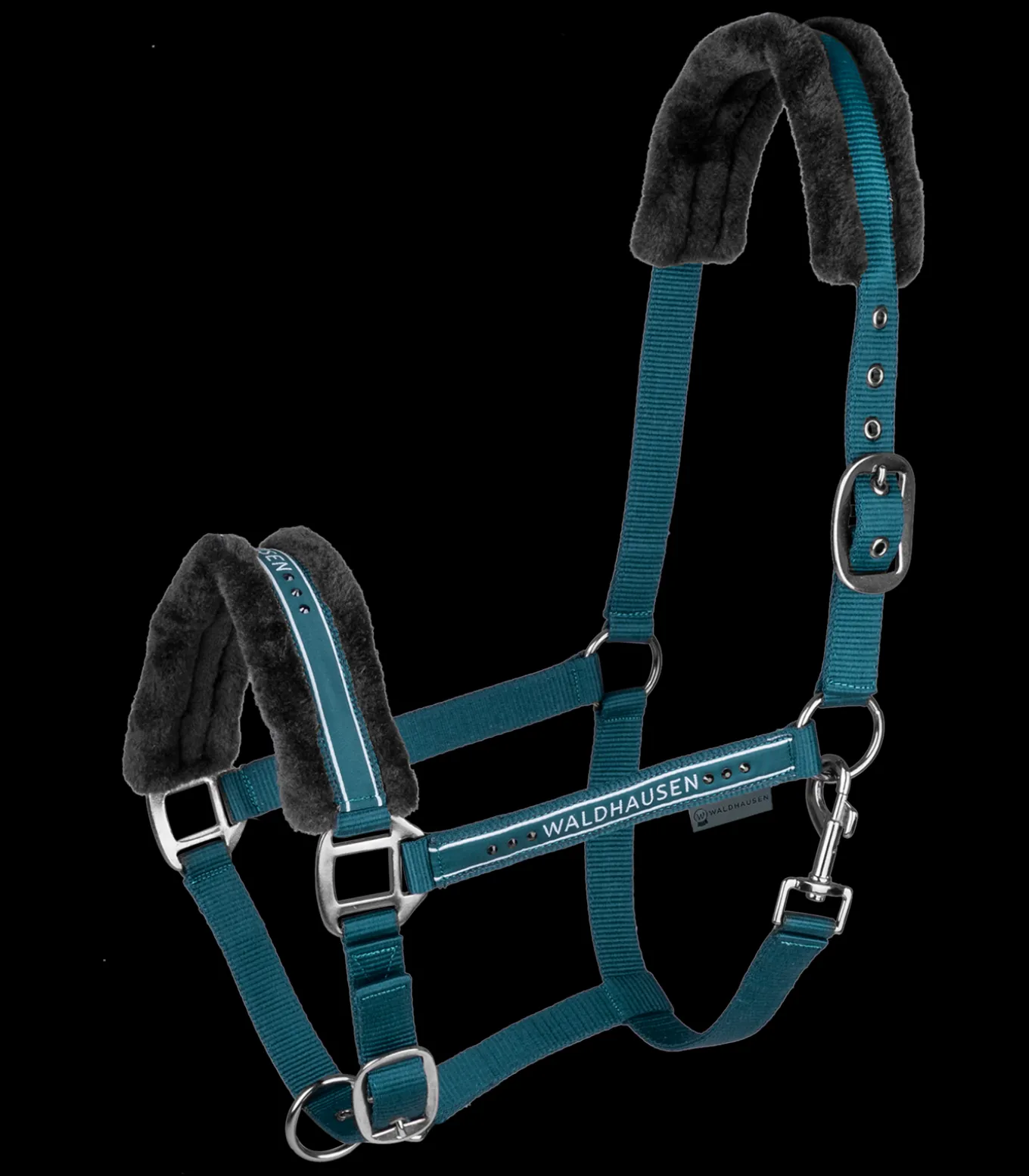 Flauschiges Halfter mit Waldhausen Fashion-Band und matten Beschlägen. Ein Highlight sind die zusätzlichen Glitzersteine auf Nasenband und Backenstücken. Weiche Polsterung aus synthetischem Fell an Genickstück und Nasenriemen. Mehrfache Verstellbarkeit an Kinnriemen und Genickstück.