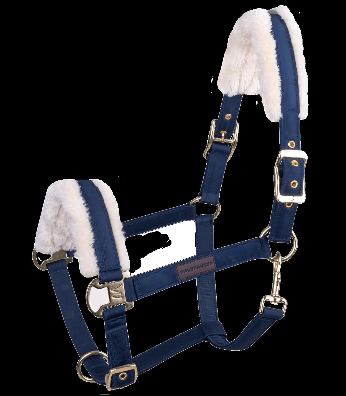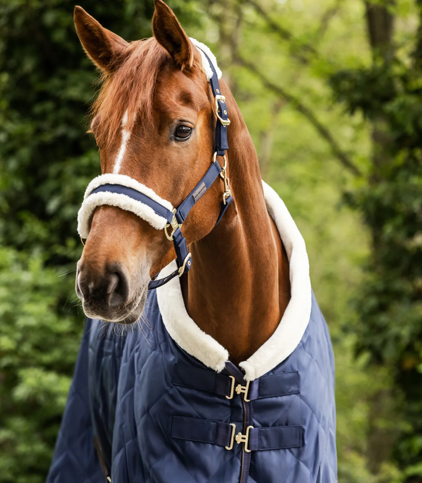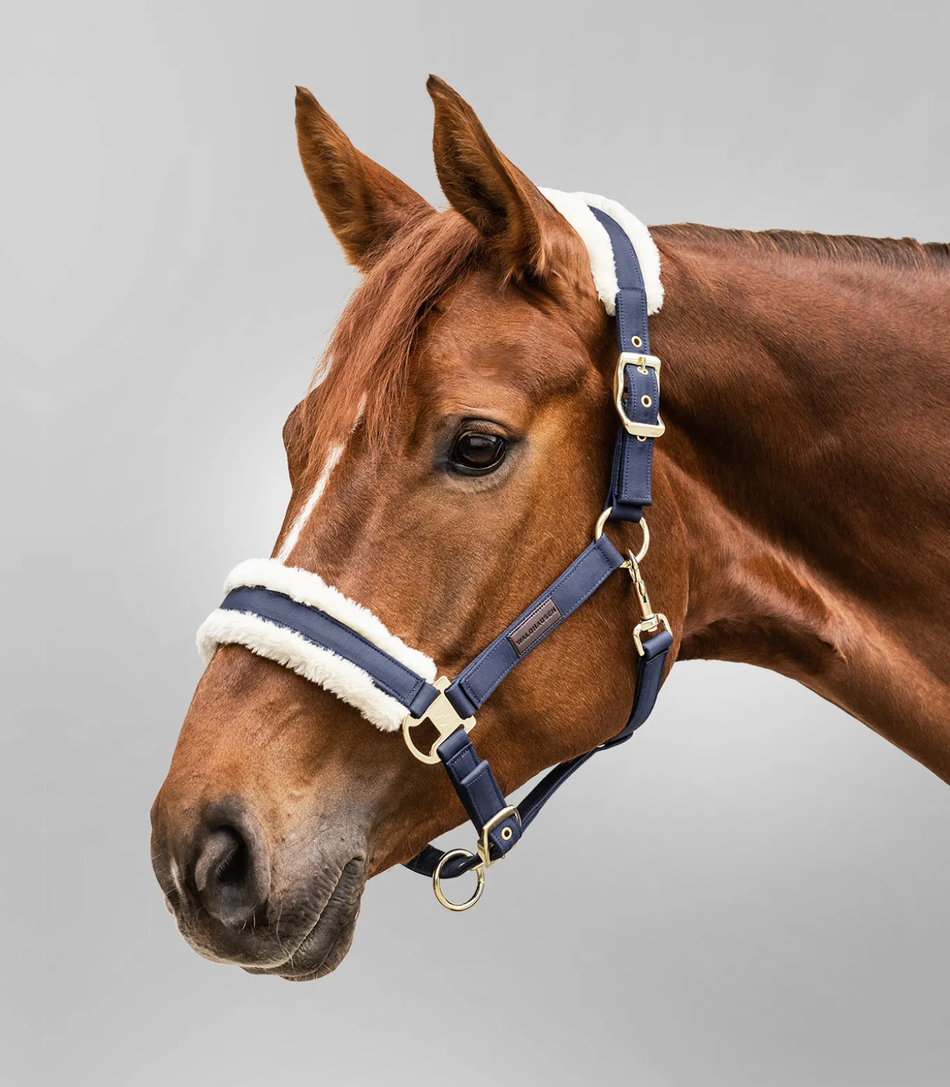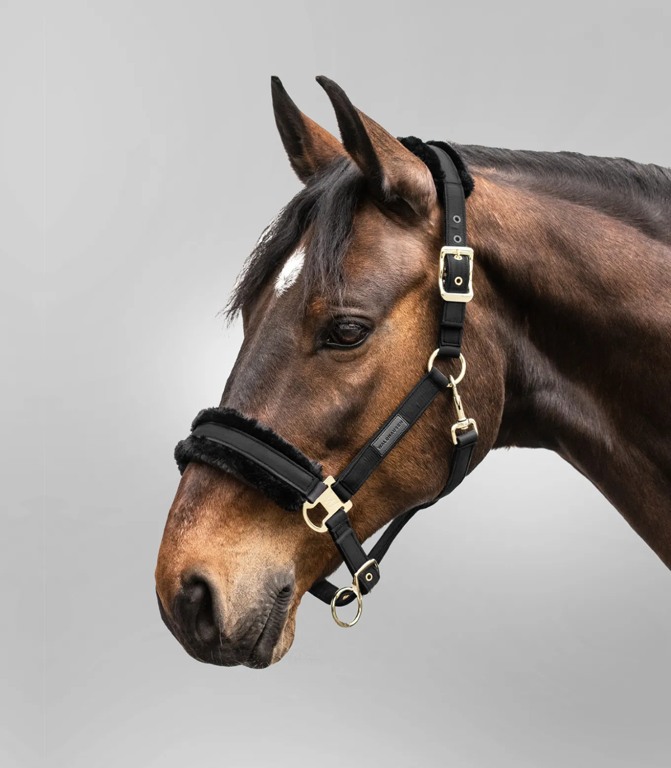 Hochwertiges Halfter mit einem edlen Satin-Überzug. Das Halfter ist mit Kunstfell an Nasenriemen und Genickstück unterlegt und bietet dadurch einen hohen Tragekomfort. Mit goldfarbenen Beschlägen. Passend zu unserer Exclusive Decken Kollektion.