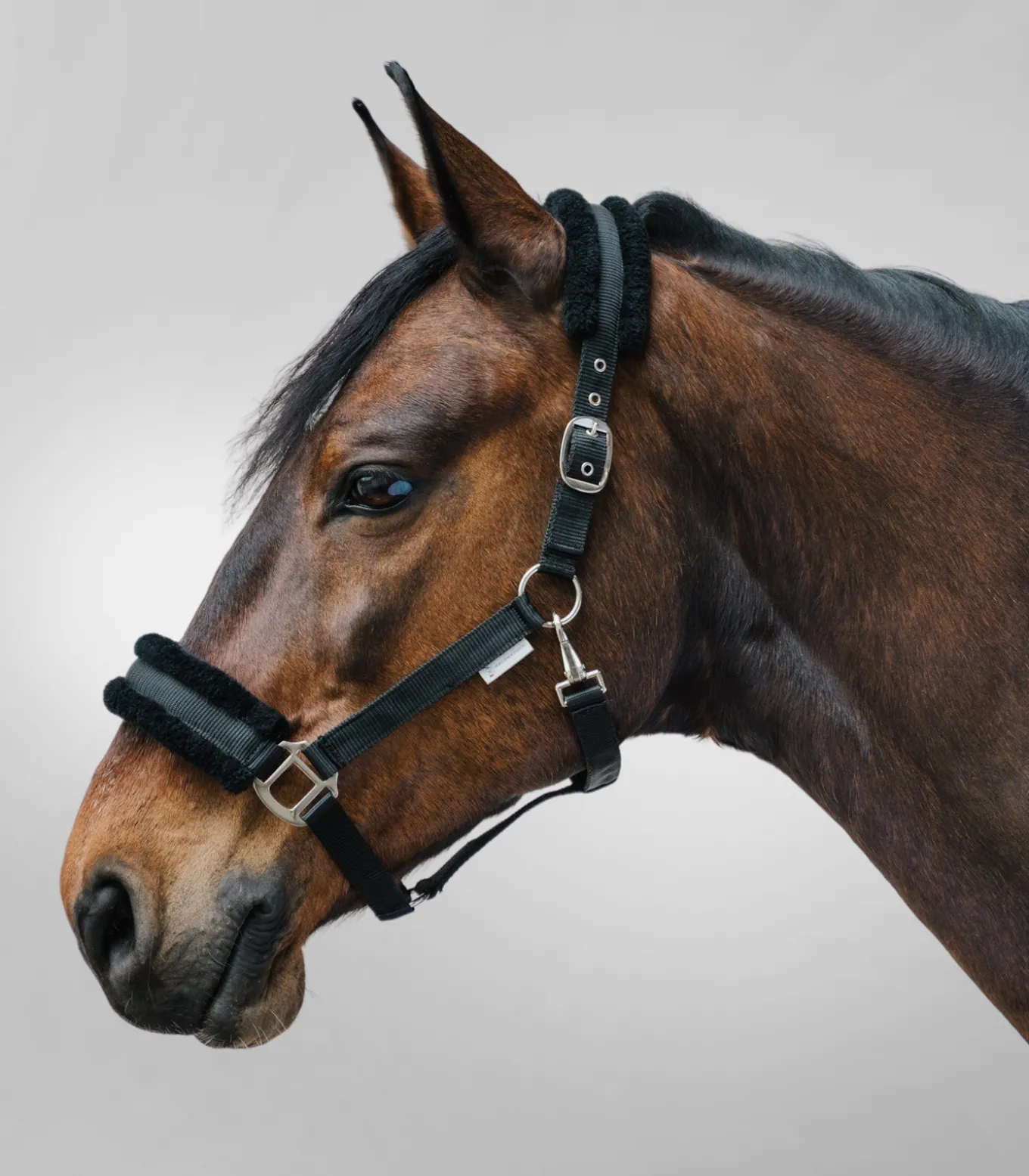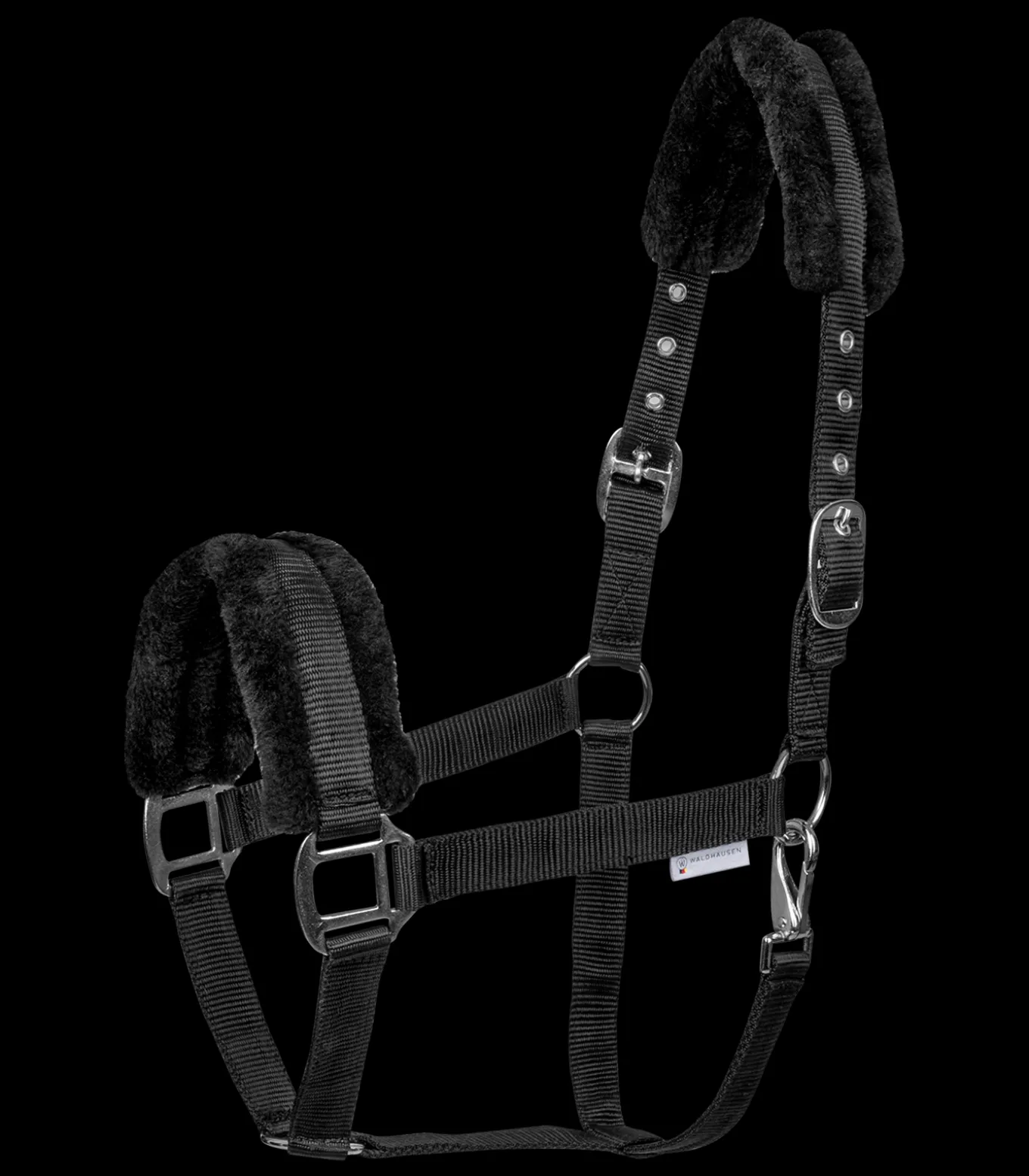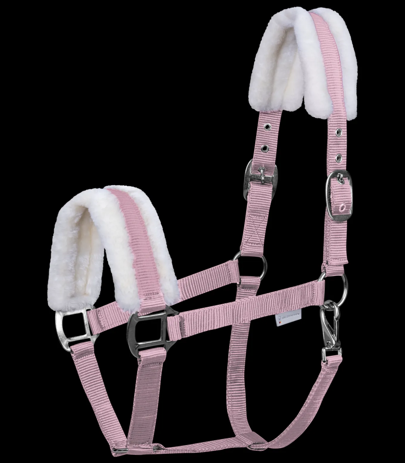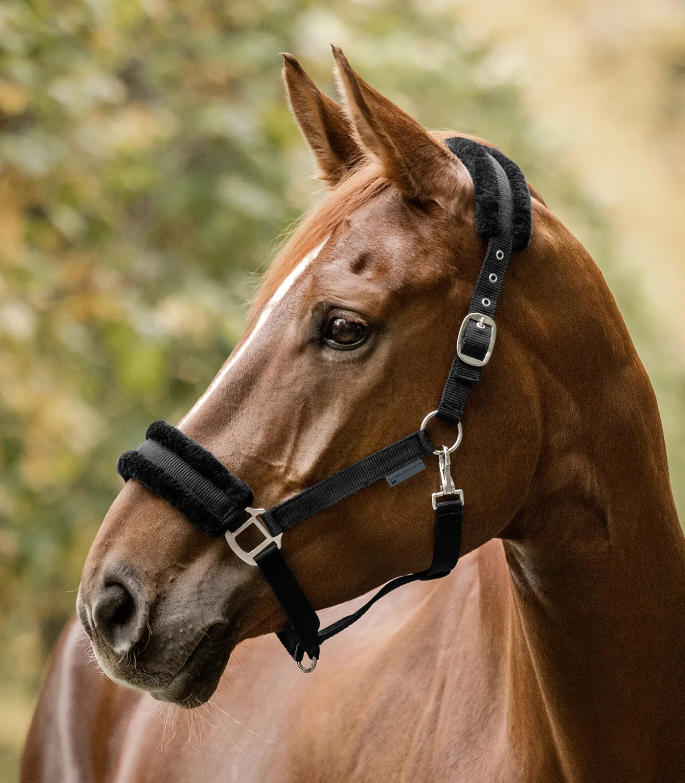 Flauschiges Halfter mit weicher Polsterung aus synthetischem Fell an Genickstück und Nasenriemen. Am Genickstück beidseitig verstelllbar.