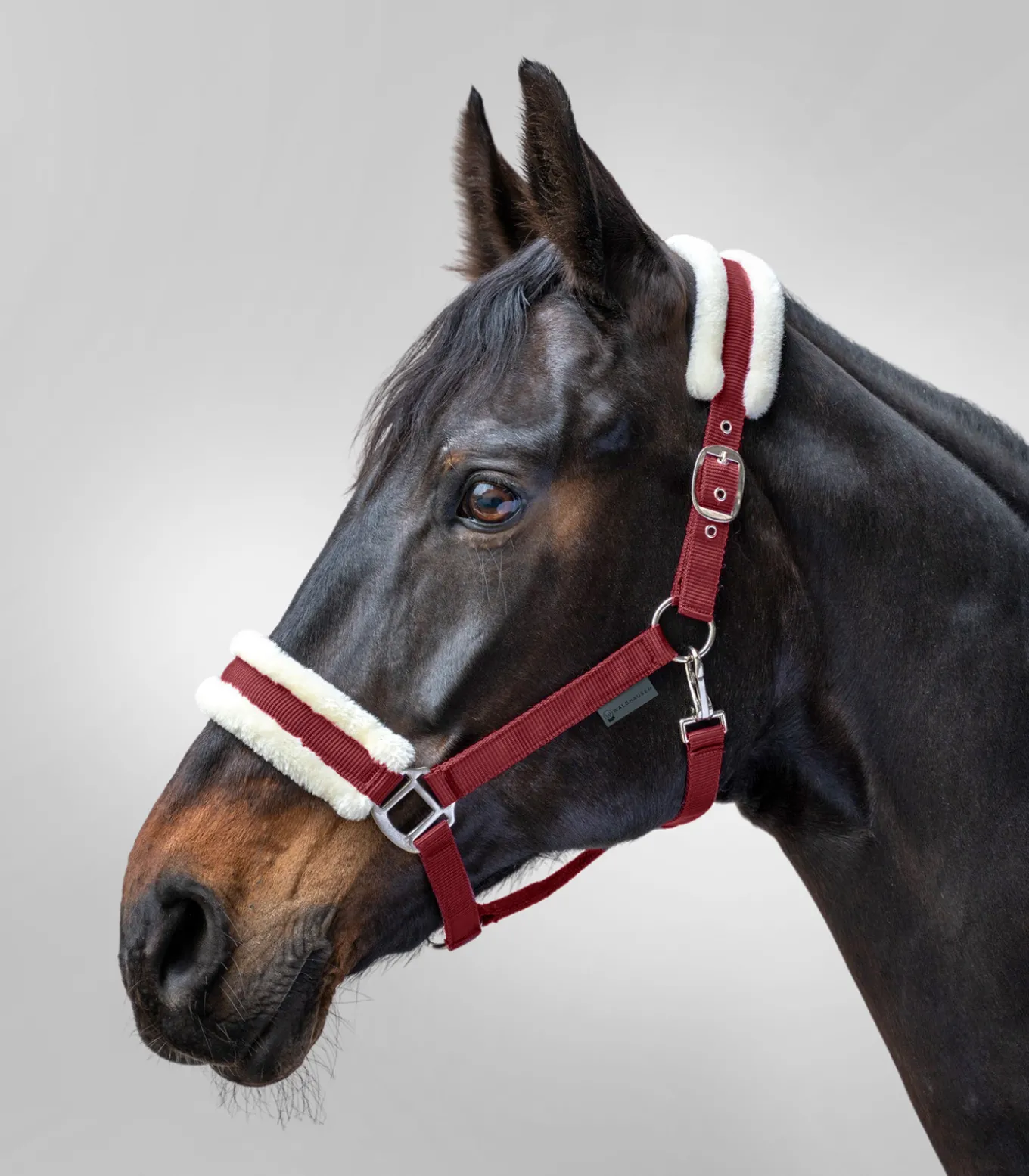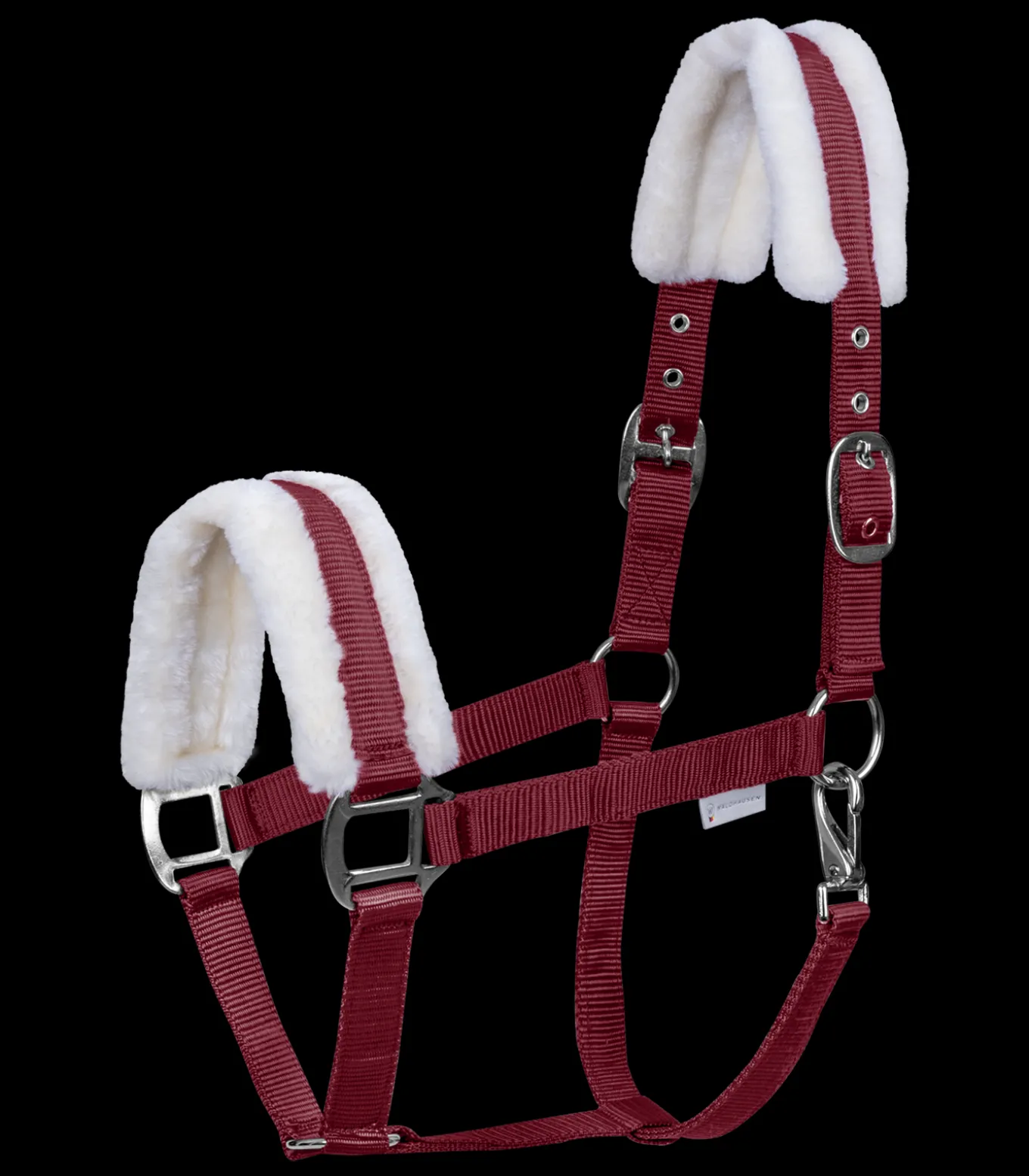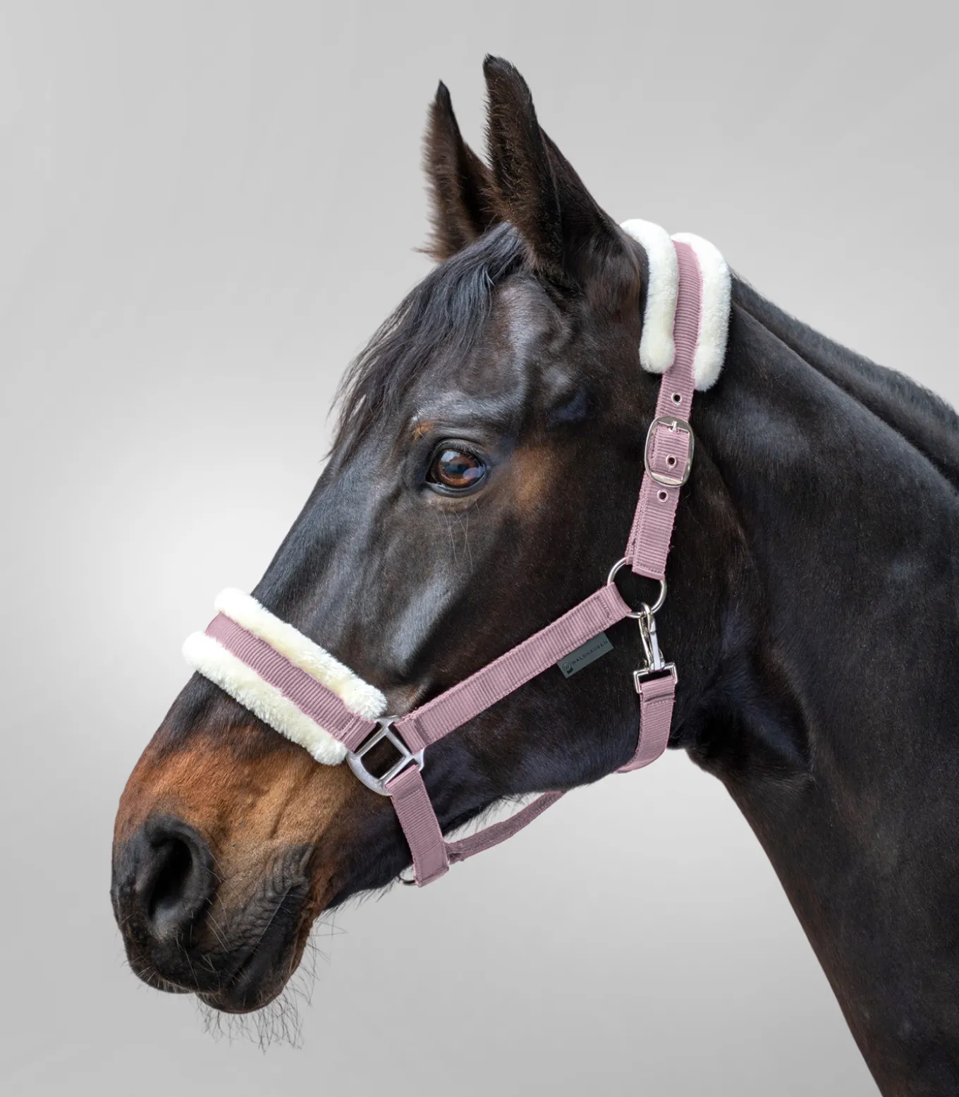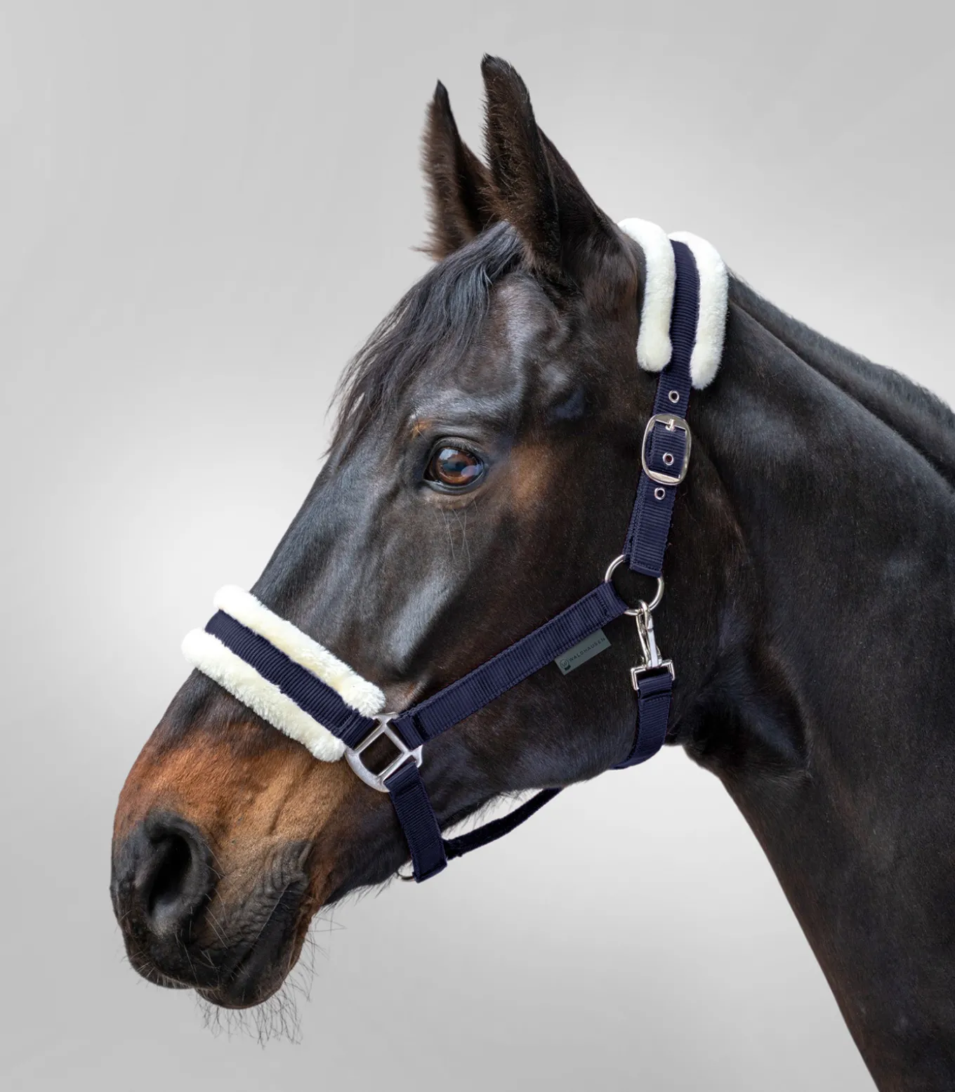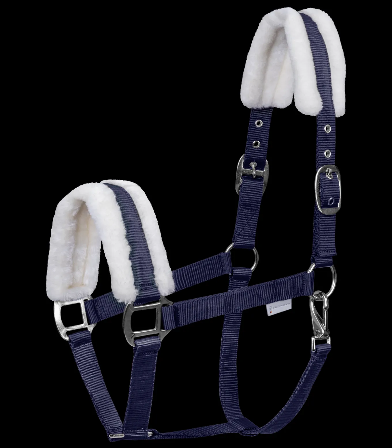 Flauschiges Halfter mit weicher Polsterung aus synthetischem Fell an Genickstück und Nasenriemen. Am Genickstück beidseitig verstelllbar.