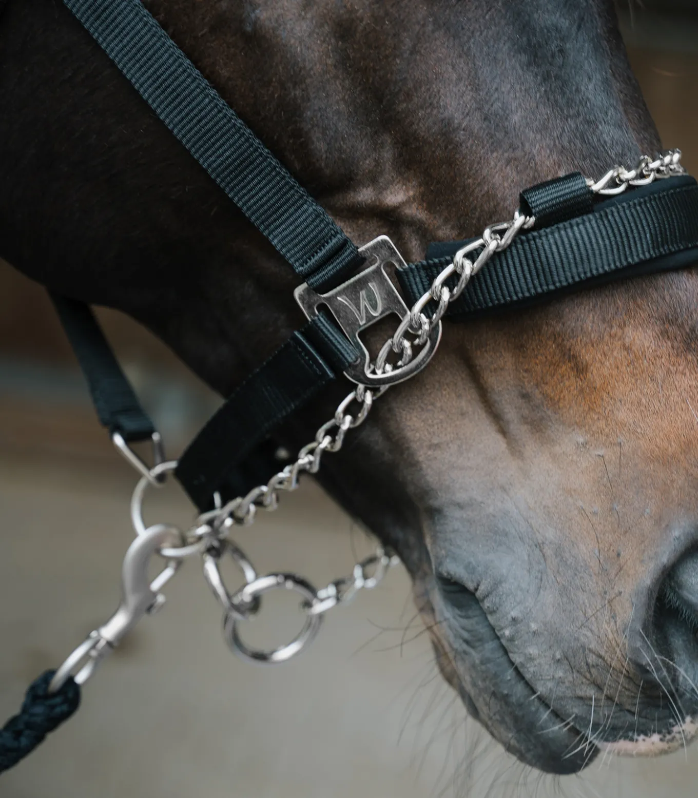Hochwertiges Halfter mit integrierter Kette am Nasenriemen. Der Führstrick kann am Halfterring, sowie am Kettenring mit geringer Einwirkung oder starker Einwirkung befestigt werden.