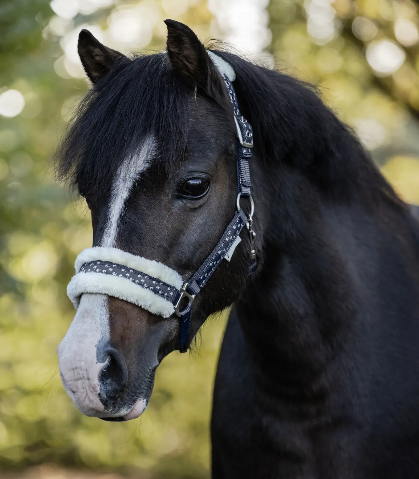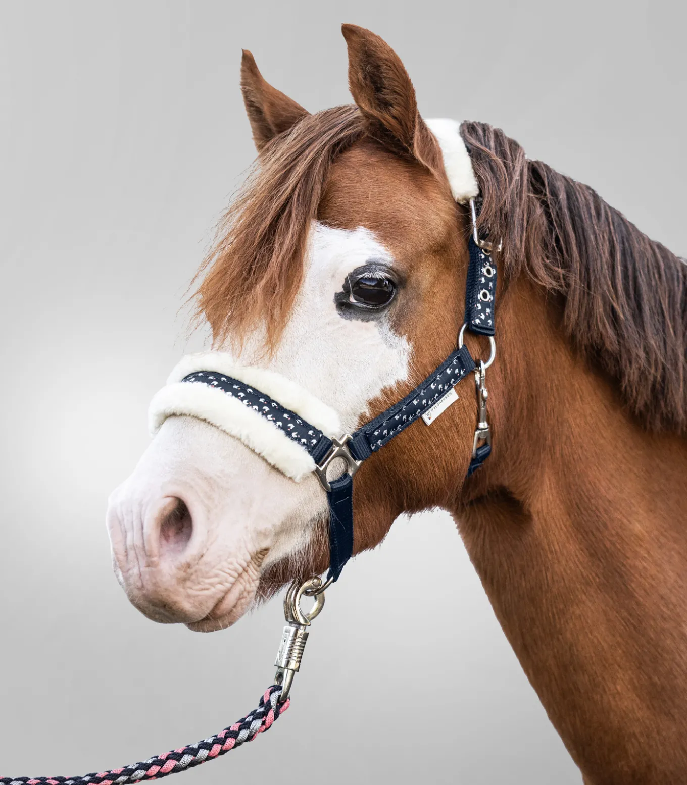 Set bestehend aus Halfter mit süßem All-Over-Print und 3-farbigem Anbindestrick. Das Halfter ist mit Kunst-Fell im Nasen-, und Genickbereich gepolstert. Mehrfach verstellbar am Genick.