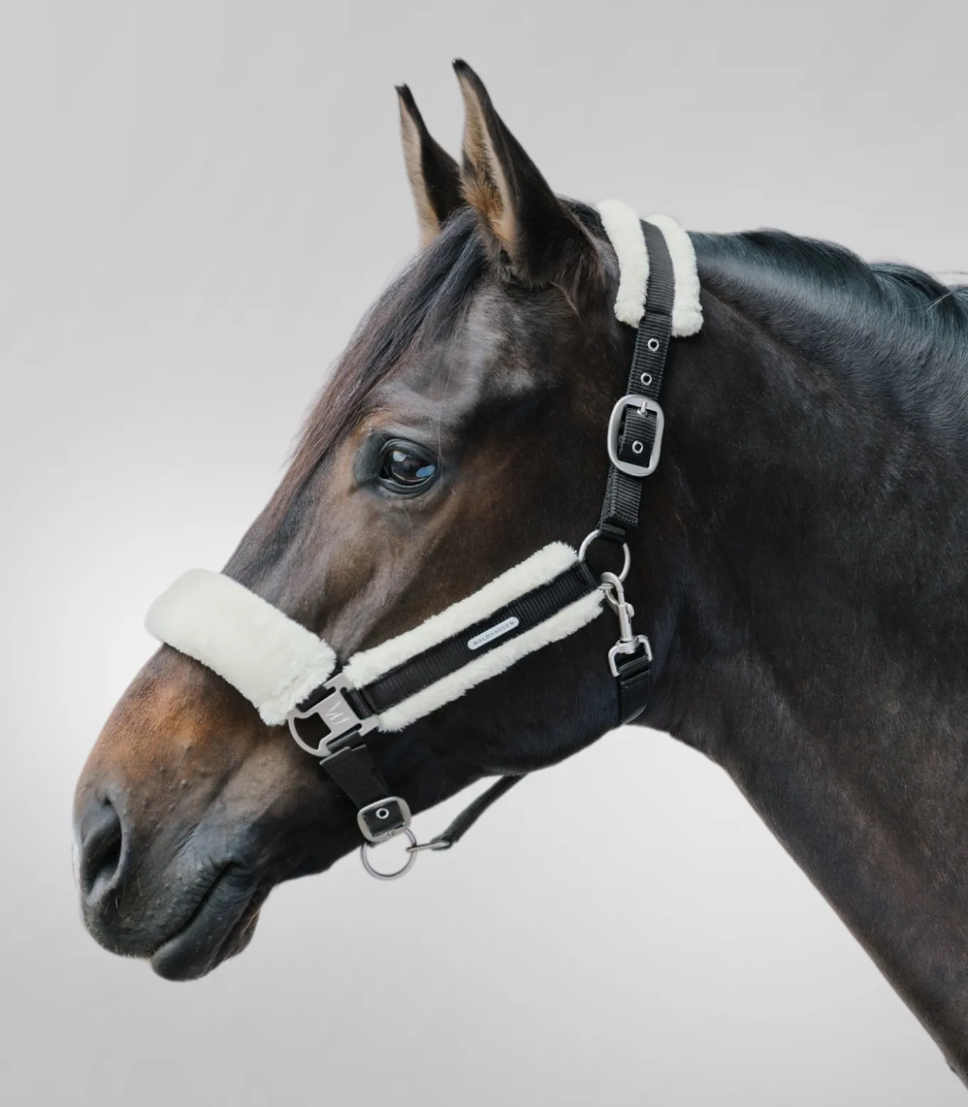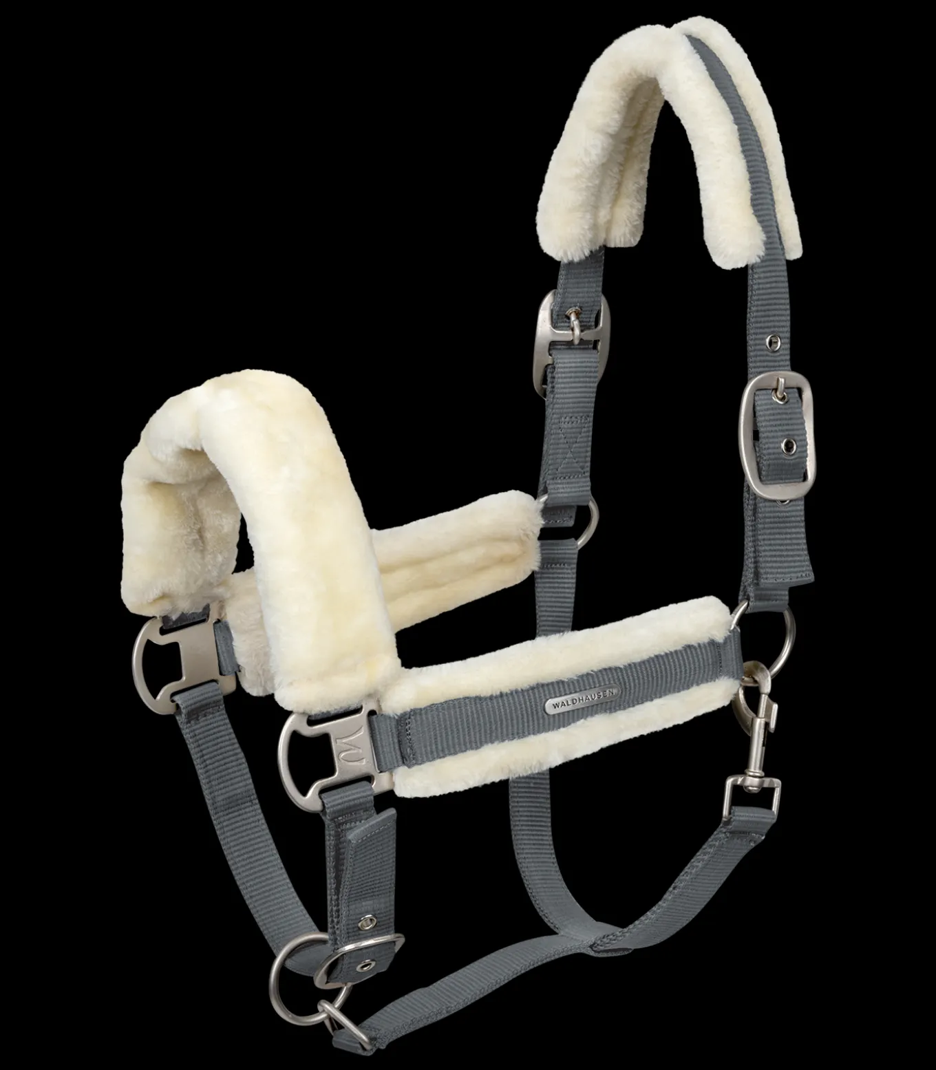 Hochwertiges Halfter mit weicher Polsterung aus synthetischem Fell an Genickstück, Nasenriemen und Backenstücken. Am Kinnriemen einfach und am Genickstück beidseitig verstellbar. Mit matten silbernen Beschlägen und silbernem Waldhausen Logo.