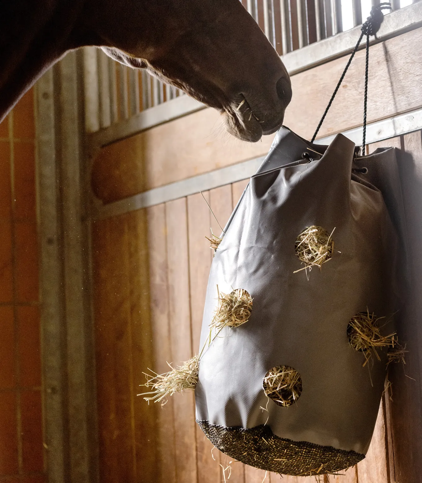Der Heusack bietet eine optimale Lösung für eine gesunde und nachhaltige Futteraufnahme. Mit 12 Löchern mit einem Lochdurchmesser von etwa 8 cm fördert er langsames, pferdegerechtes Fressen. Die glatte Materialoberfläche vorbeugt Verletzungen am Pferdemaul vor. Der Haybag von Waldhausen überzeugt durch seine einfache Befüllbarkeit und Reinigung, reduziert Heuverschwendung sowie Staubbelastung und sorgt dafür, dass Staub und Wasser durch den Netzboden herausfallen können. So atmet Ihr Pferd weniger Heustaub ein. Der Heusack kann bei Bedarf auch bewässert werden. Universell einsetzbar und leicht zu befestigen, vereint der Heusack viele Vorteile in einem Produkt und trägt zur gesunden und sauberen Fütterung bei.