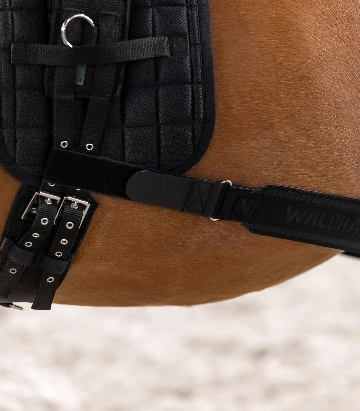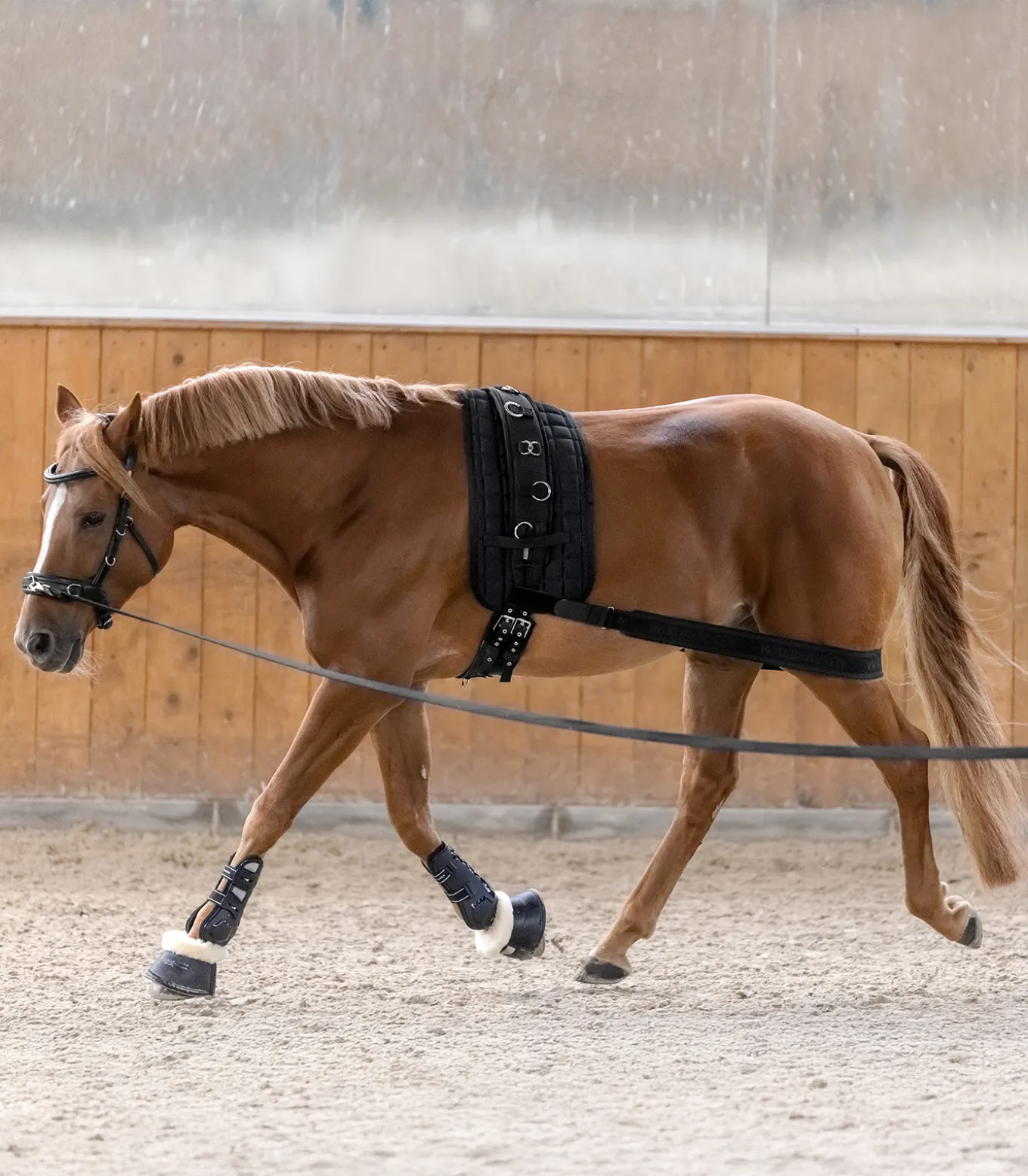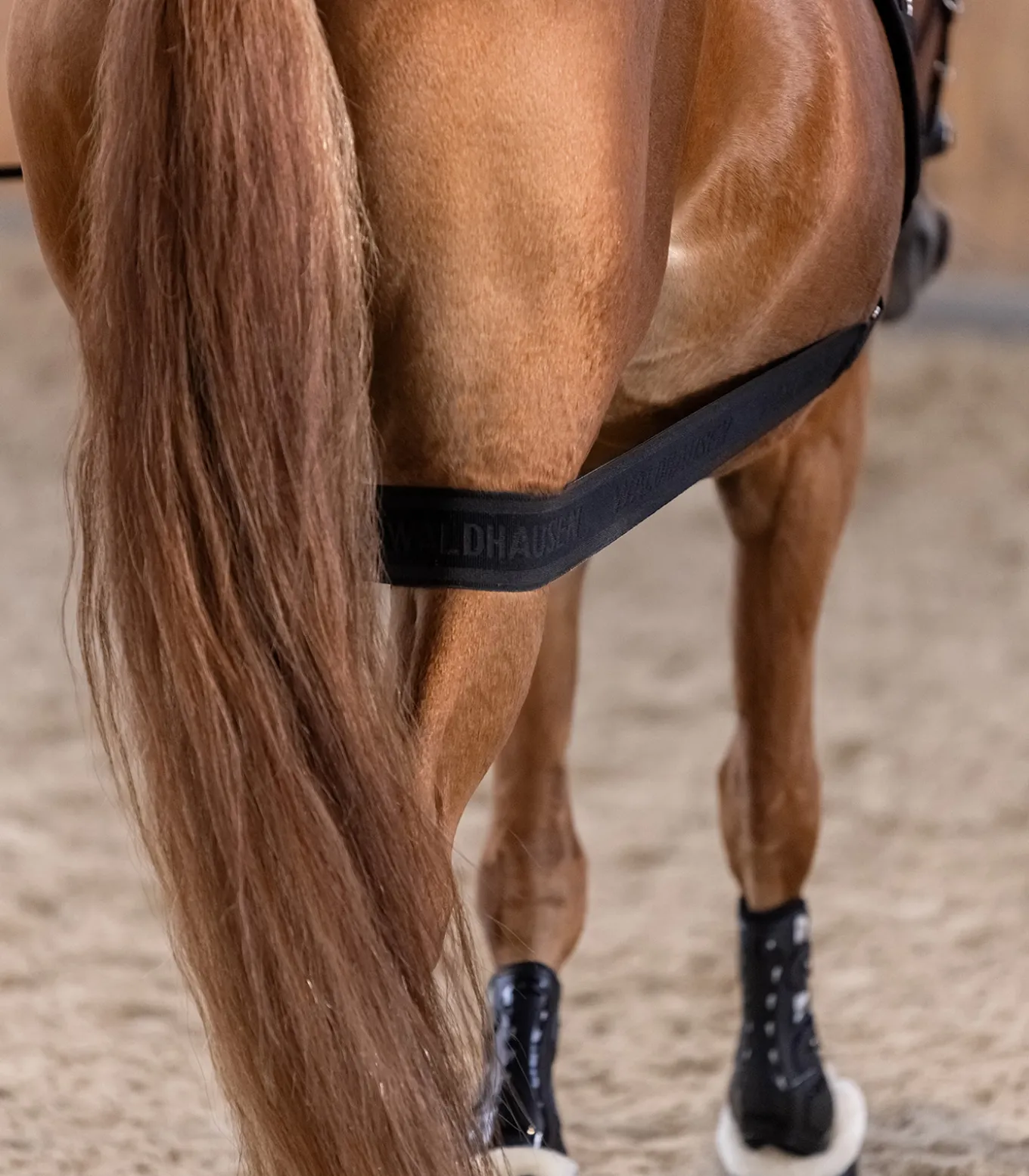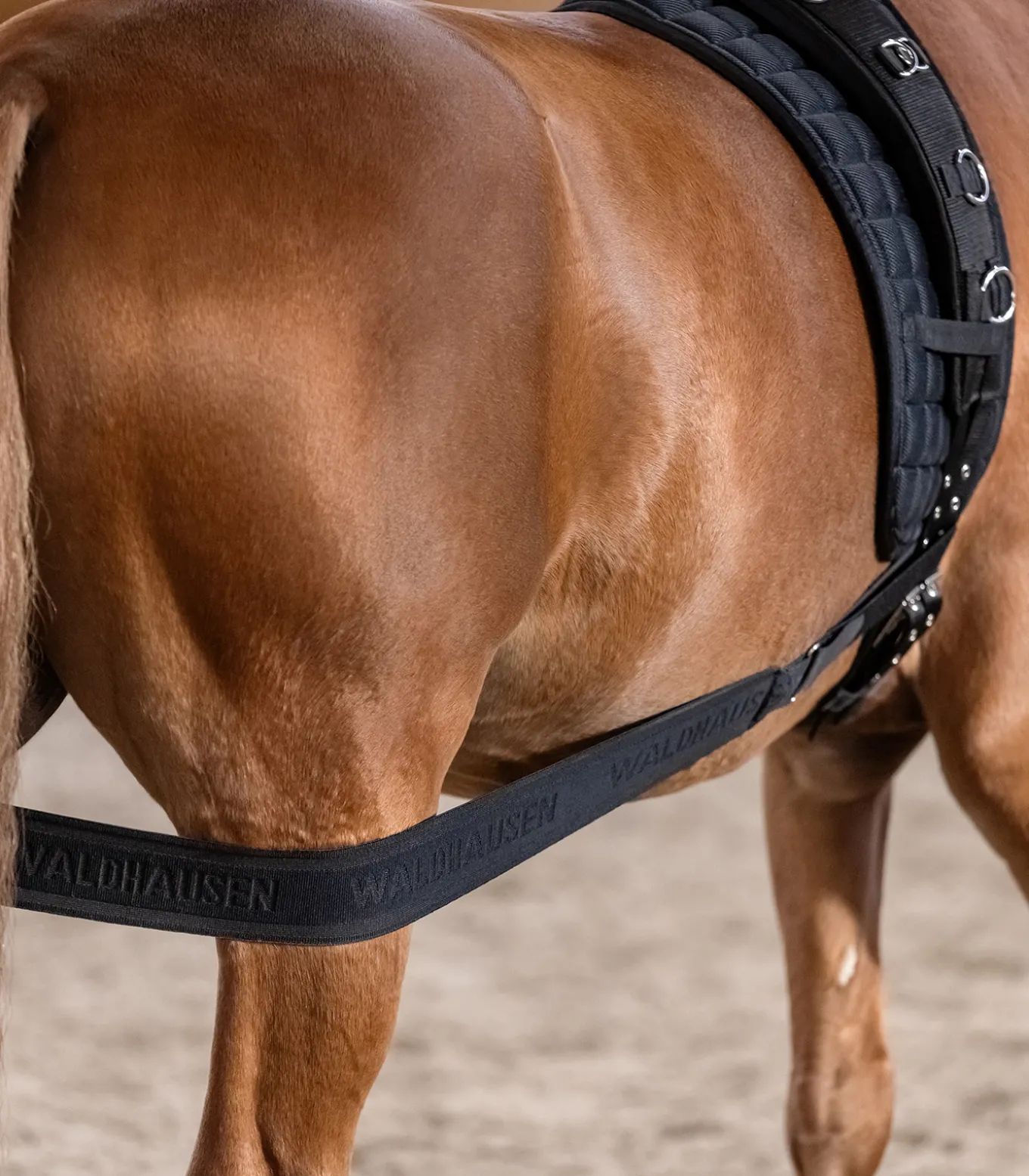 Die Körperbandage von Waldhausen ist ein Hilfsmittel, das speziell entwickelt wurde, um die Hinterhand des Pferdes zu aktivieren. Durch das Anliegen des Bands an der Hinterhand, wird das Pferd dazu animiert mehr mit der Hinterhand unterzutreten und vermehrt Last aufzunehmen. Das hochelastische Material der Bandage sorgt für einen optimalen Sitz und ermöglicht eine einfache Handhabung. Dank des beidseitigen Klettverschlusses lässt sich die Bandage schnell und unkompliziert sowohl am Longiergurt, als auch am Sattelgurt befestigen und in der Länge verstellen, sodass sie individuell an das Pferd angepasst werden kann. Kann beim Reiten oder Longieren verwendet werden.