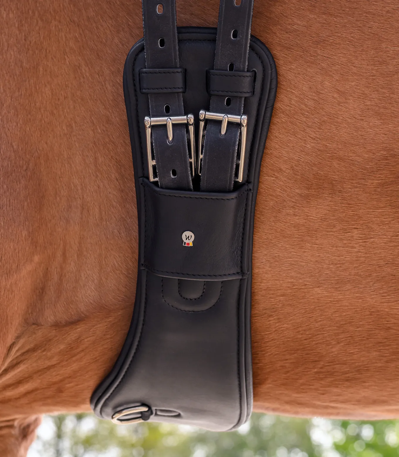 Mondgurt für eine bessere Gurtlage bei bauchigen Pferden und wenn der Sattel dazu neigt nach vorne zu rutschen. Aus hochwertigem Leder gefertigt mit sehr weicher Polsterung. Mit D-Ring und Rollschnallen aus Edelstahl. Elastik an beiden Seiten.