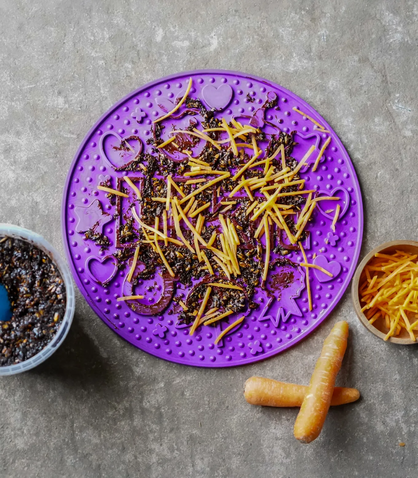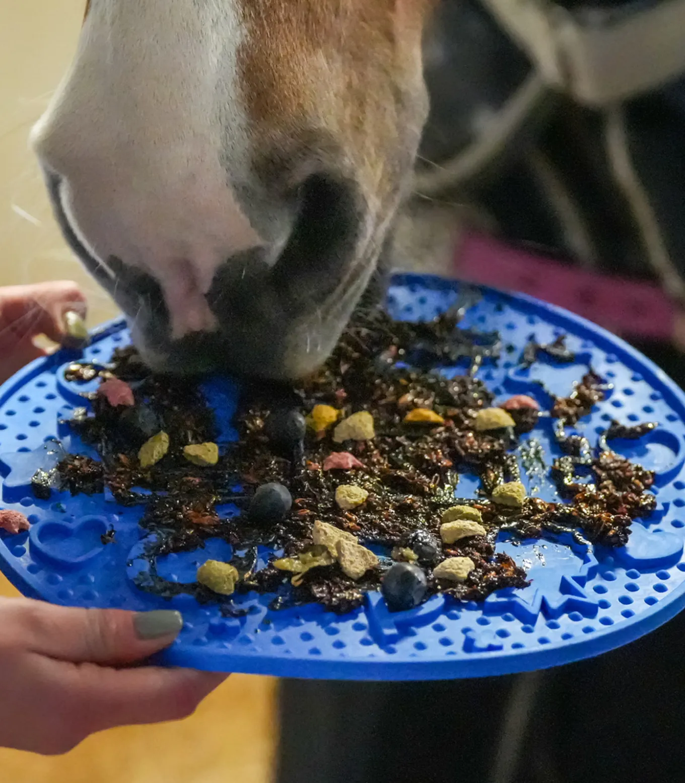 Einfach mit der Likit Graze Paste oder Mash bestreichen und nach Belieben mit Futter, Möhren oder Leckerlis bestreuen, die Möglichkeiten für verschiedene Rezepte sind endlos. Alternativ kann man die Matte auch in einen Futtereimer legen und als Slow-Feeder verwenden.