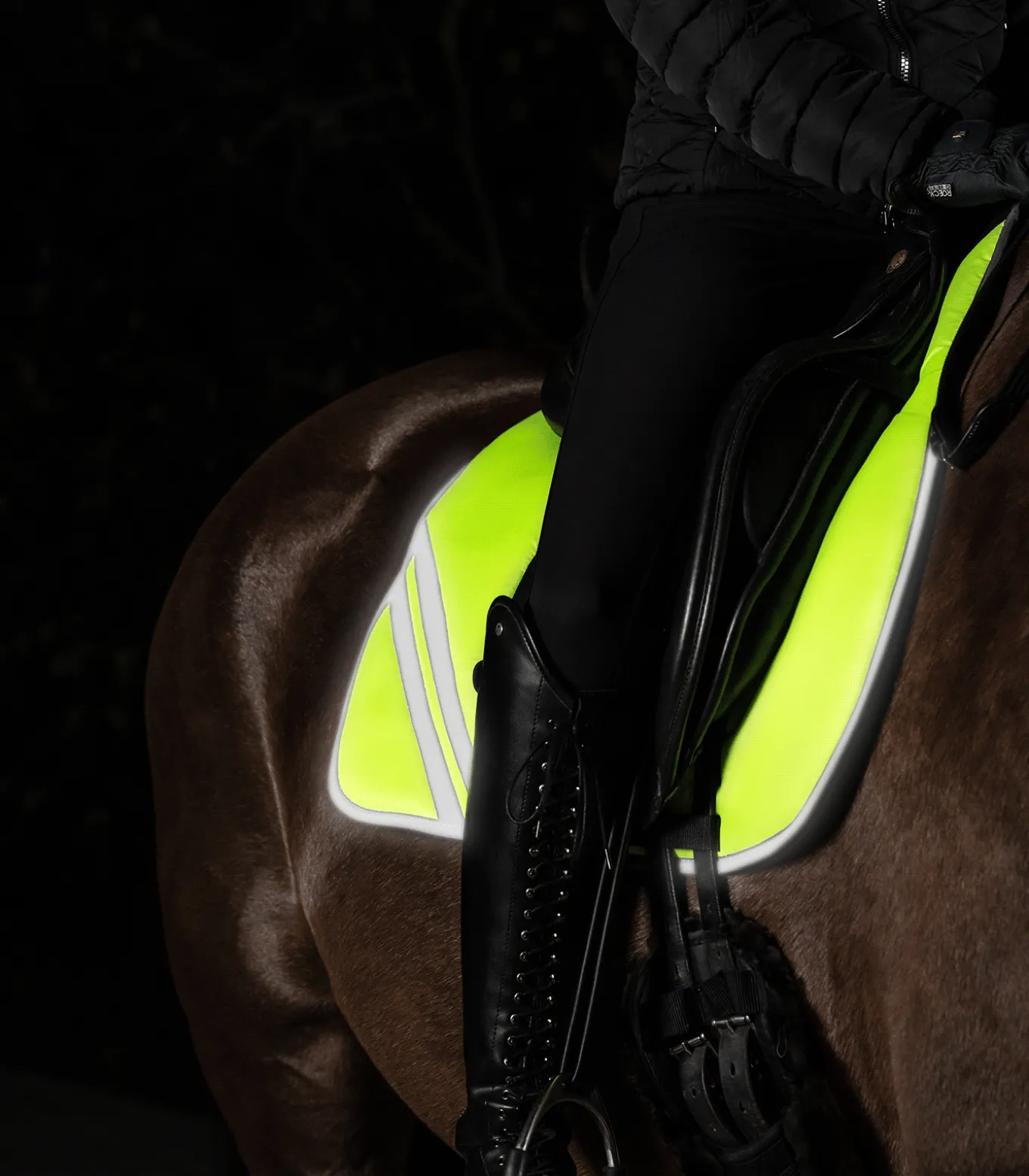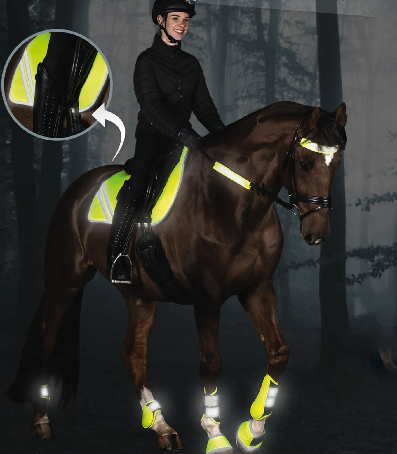 unsere Produkte sorgen bei Dunkelheit für mehr Sicherheit und Sichtbarkeit von Pferd und Reiter.