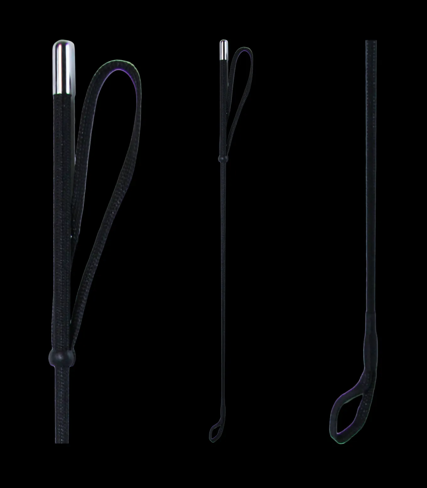 Farbig besponnene Reitgerte mit Nylon-Handschlaufe und silberfarbener Abschlusskappe.