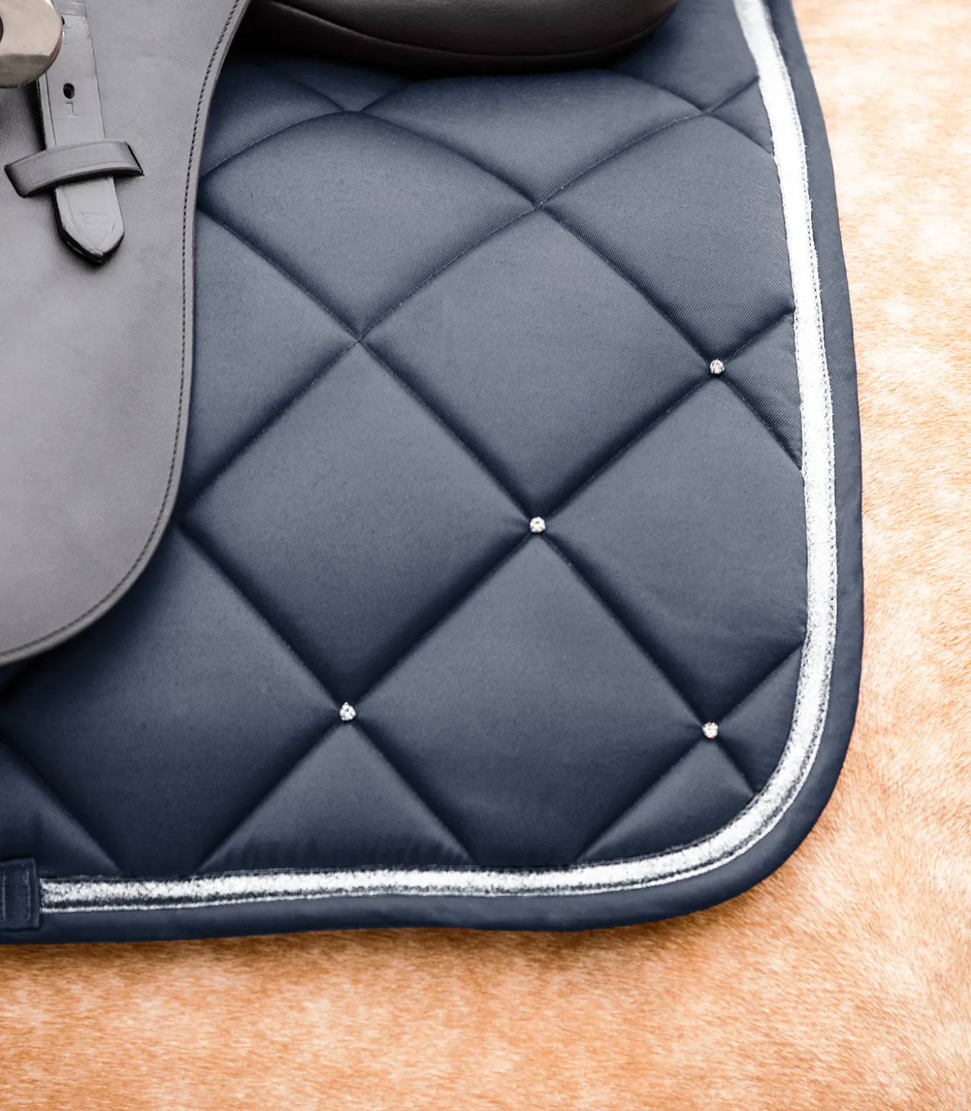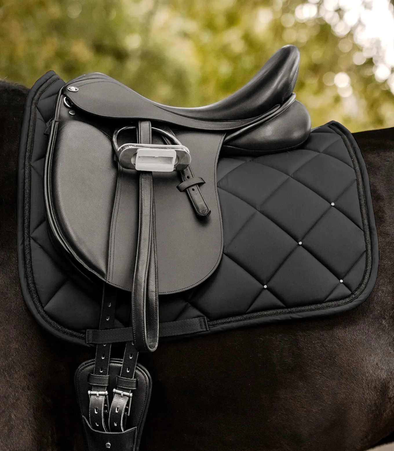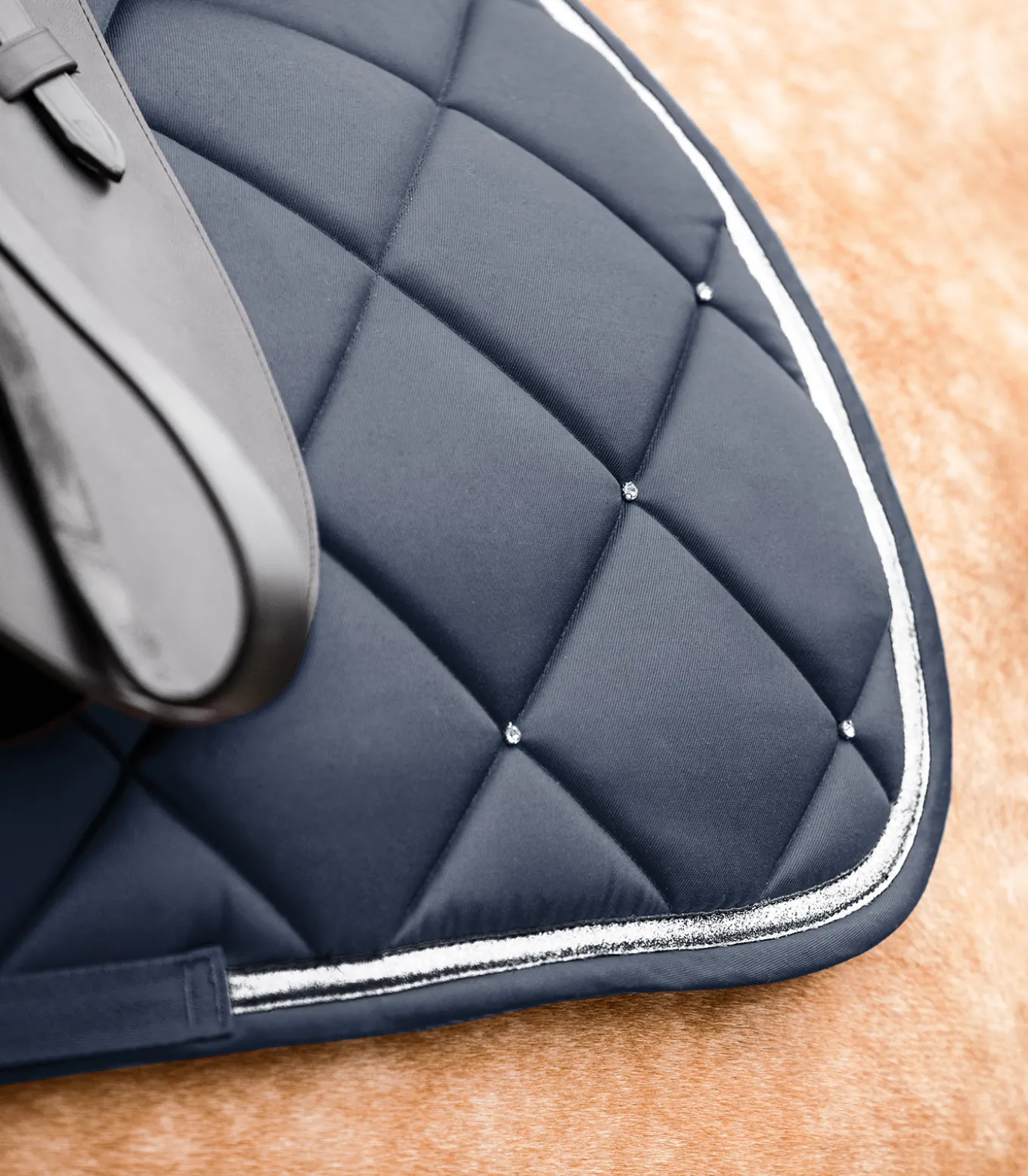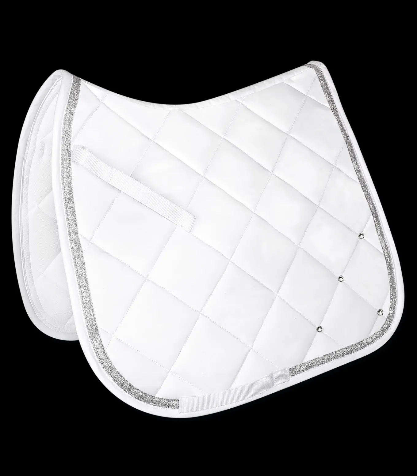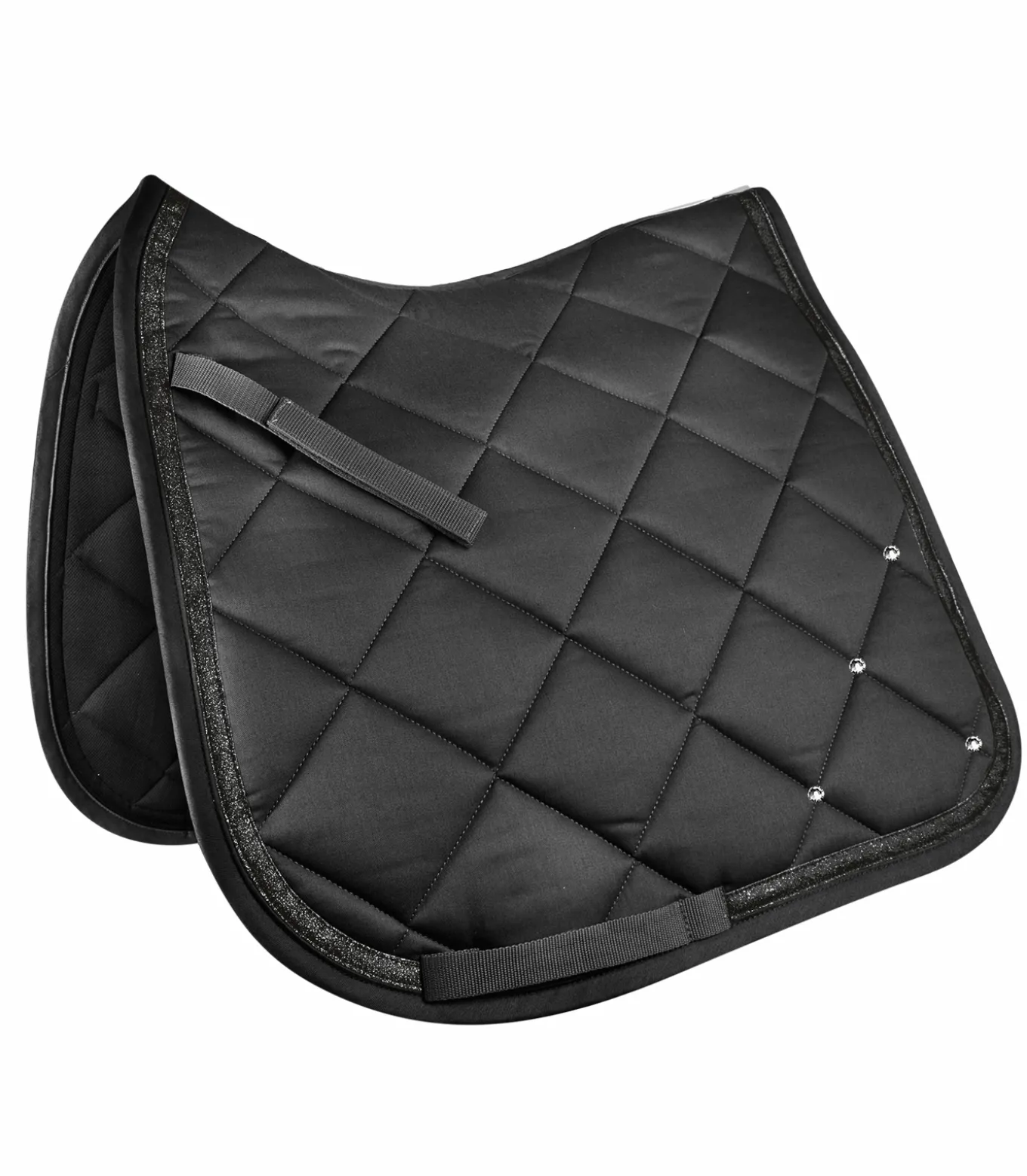 Elegante, hochwertige Schabracke mit Glitzerband. Die zusätzlichen Glitzersteine machen diese Schabracke zu einem echten Hingucker. Die funktionelle Unterseite sorgt für eine optimale Atmungsaktivität. 8 mm Schaum und 250 g/m² Watte gewährleisten beste Druckverteilung.