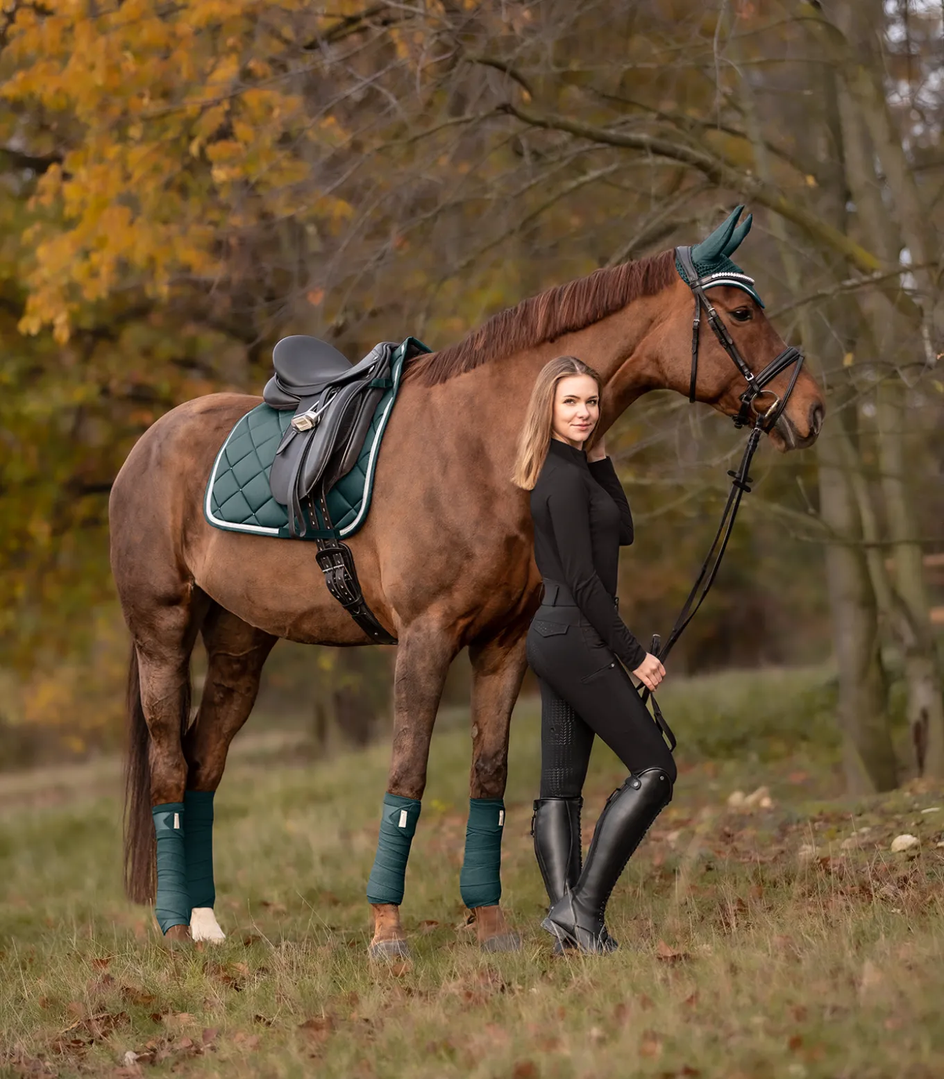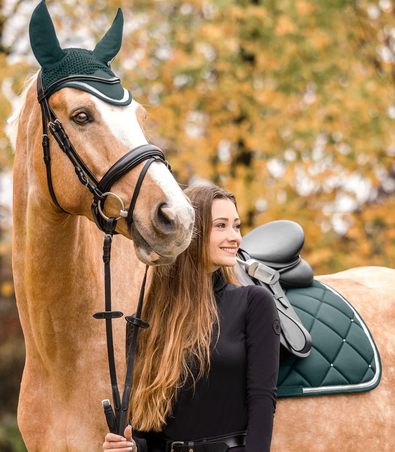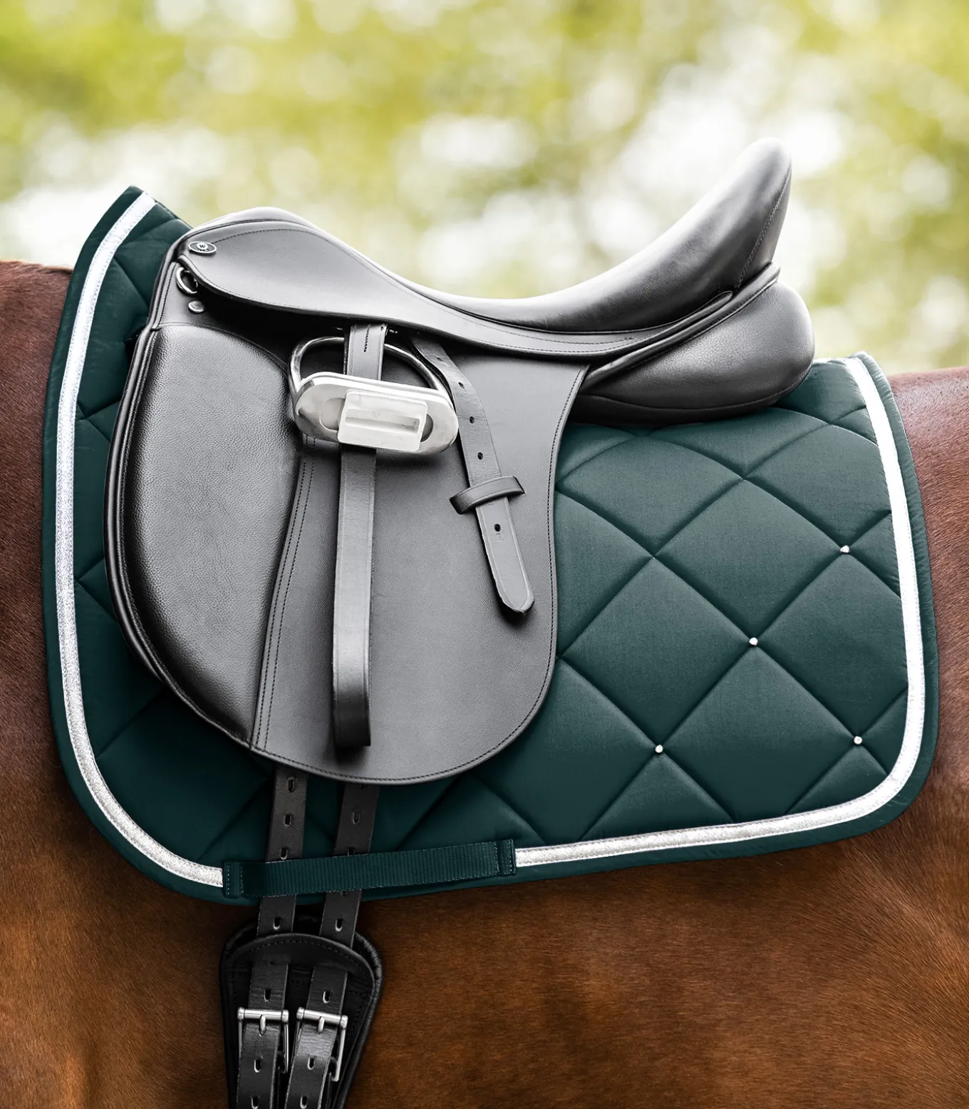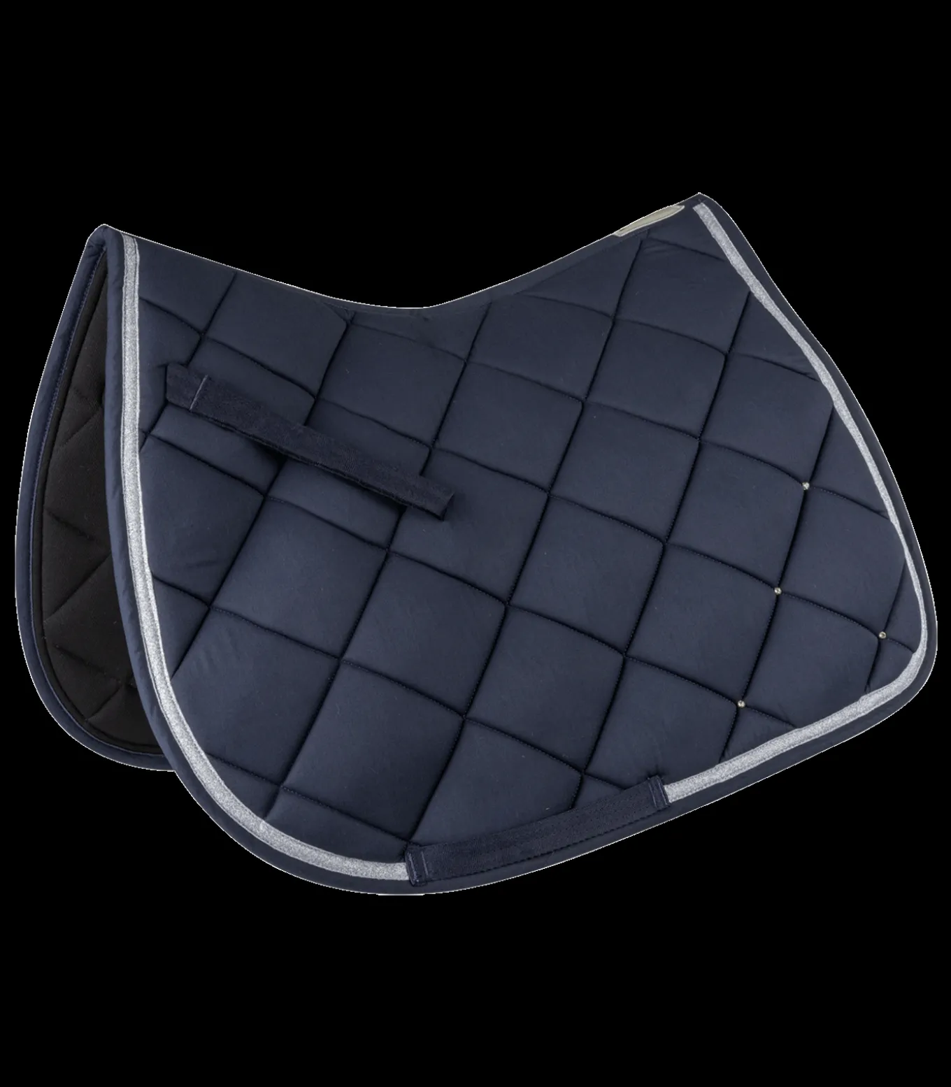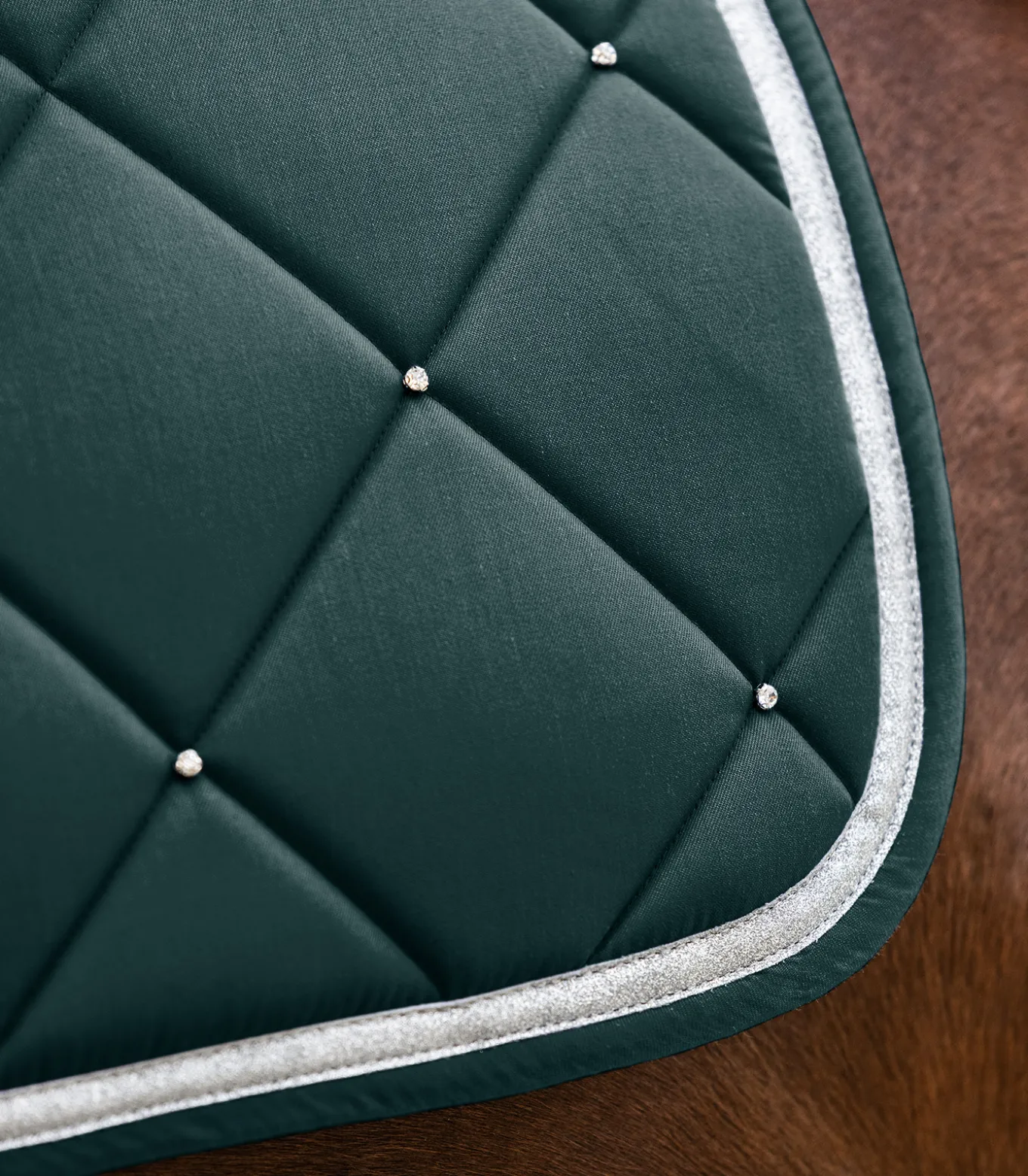 Elegante, hochwertige Schabracke mit Glitzerband. Die zusätzlichen Glitzersteine machen diese Schabracke zu einem echten Hingucker. Die funktionelle Unterseite sorgt für eine optimale Atmungsaktivität. 8 mm Schaum und 250 g/m² Watte gewährleisten beste Druckverteilung.