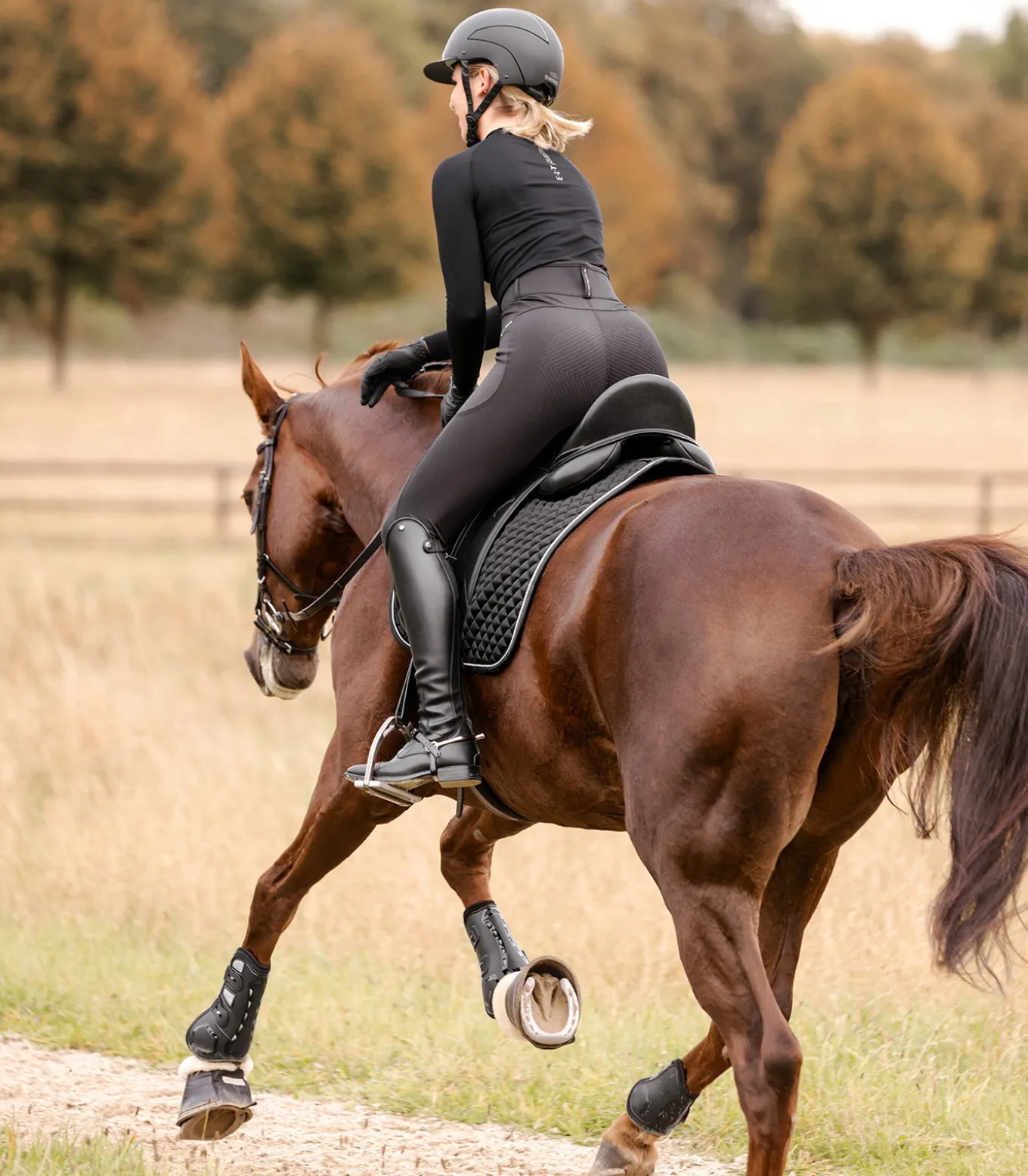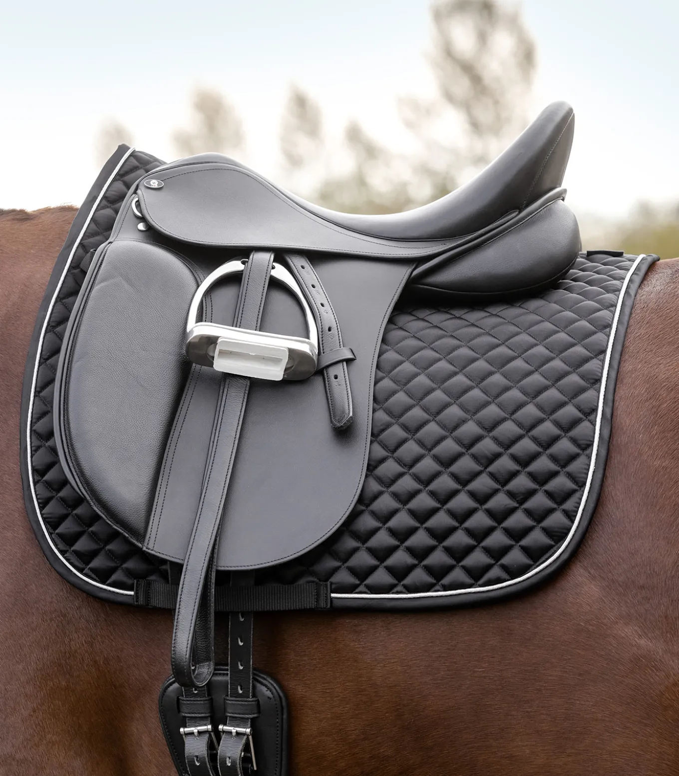 Zeitlose Schabracke in Shiny-Optik mit einer glänzenden Kordel. Gute Atmungsaktivität und Schweißabsorption. 15 mm Spezialschaum wirken druckausgleichend und stoßdämpfend.