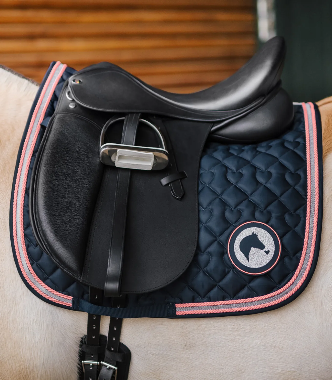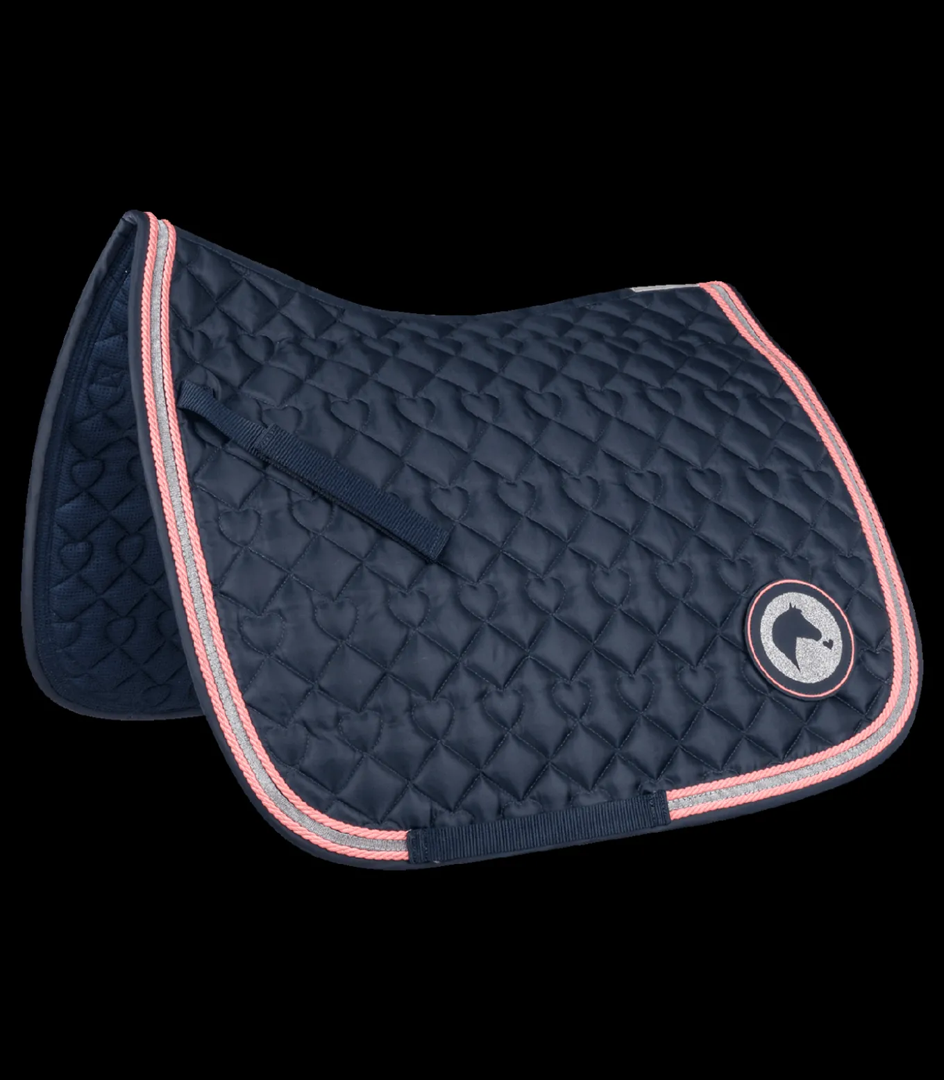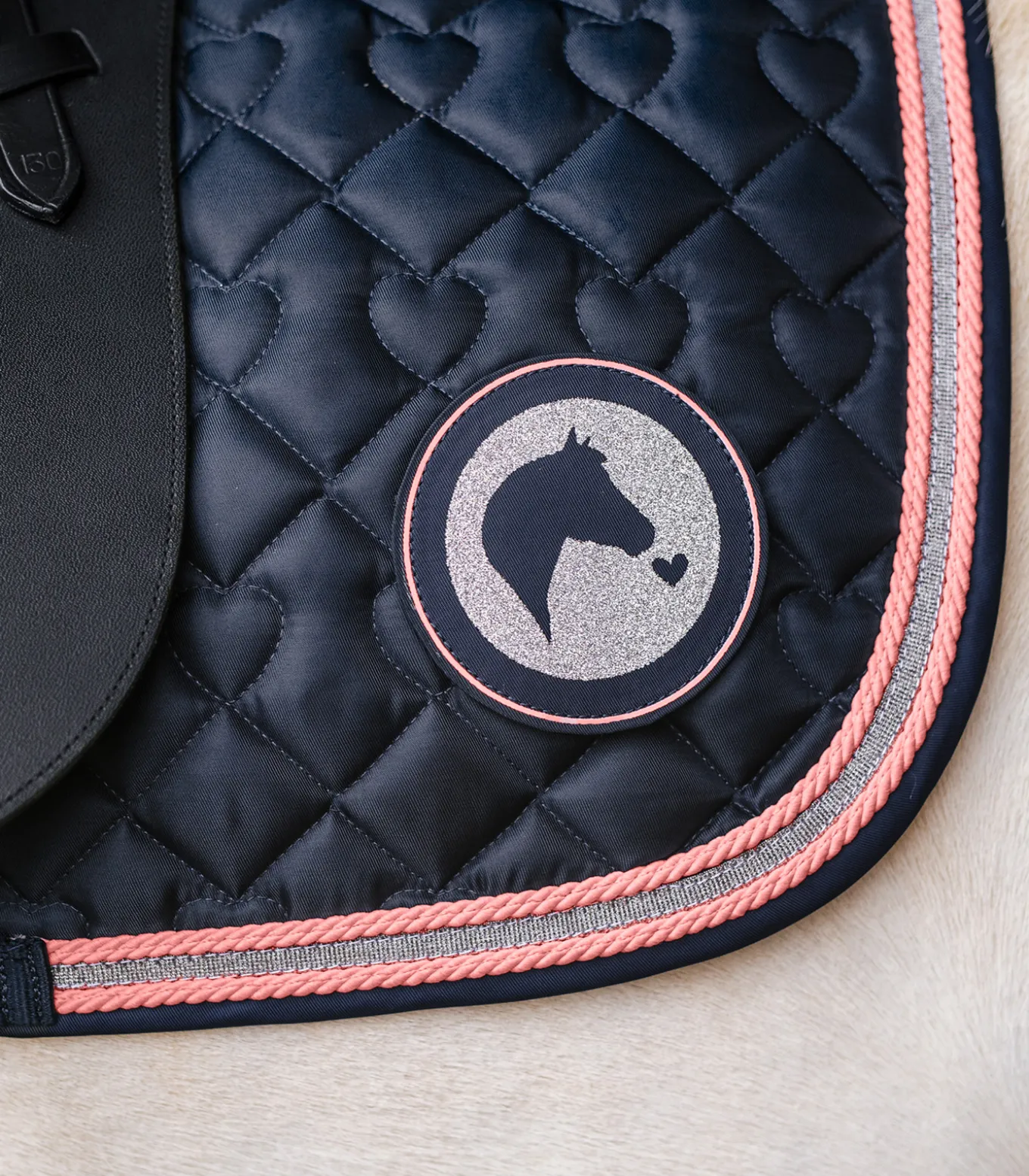 Hochwertige Schabracke mit Herzchen Steppung und silber Glitzerkordel. Abgerundet wird die Schabracke mit einem süßen glitzer Kindermotiv. 200g/m² Wattierung und 10 mm Spezialschaum sorgen für einen optimalen Druckausgleich und Stoßdämpfung.