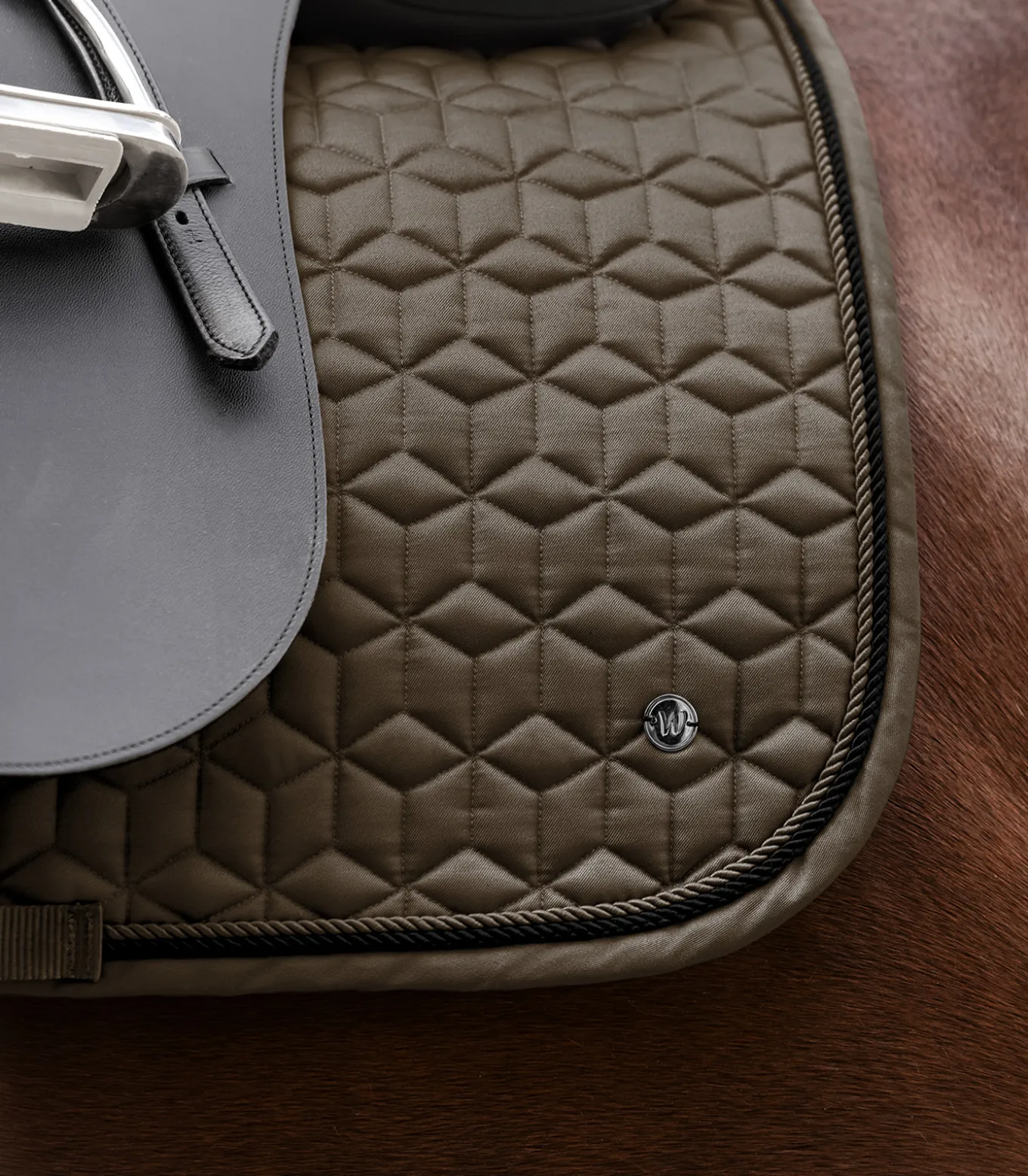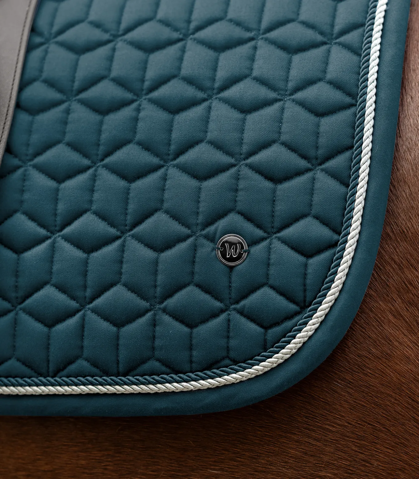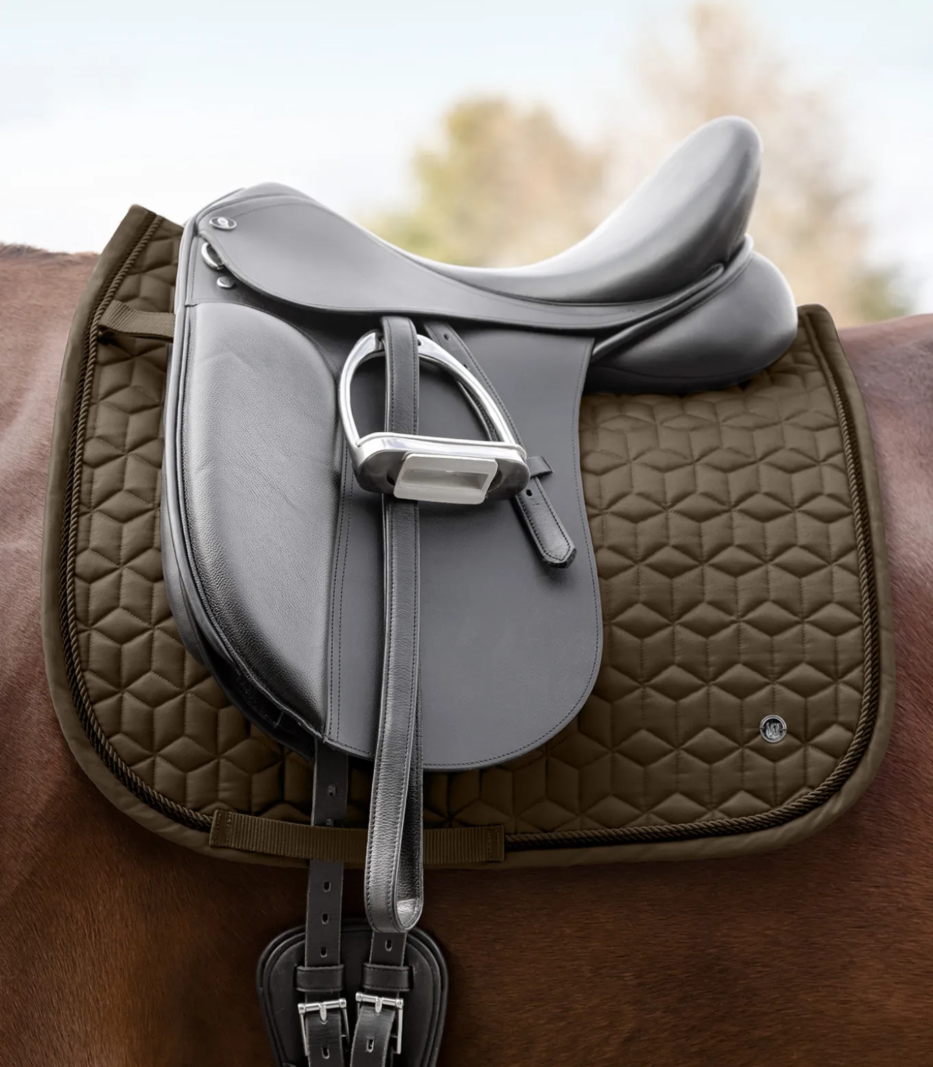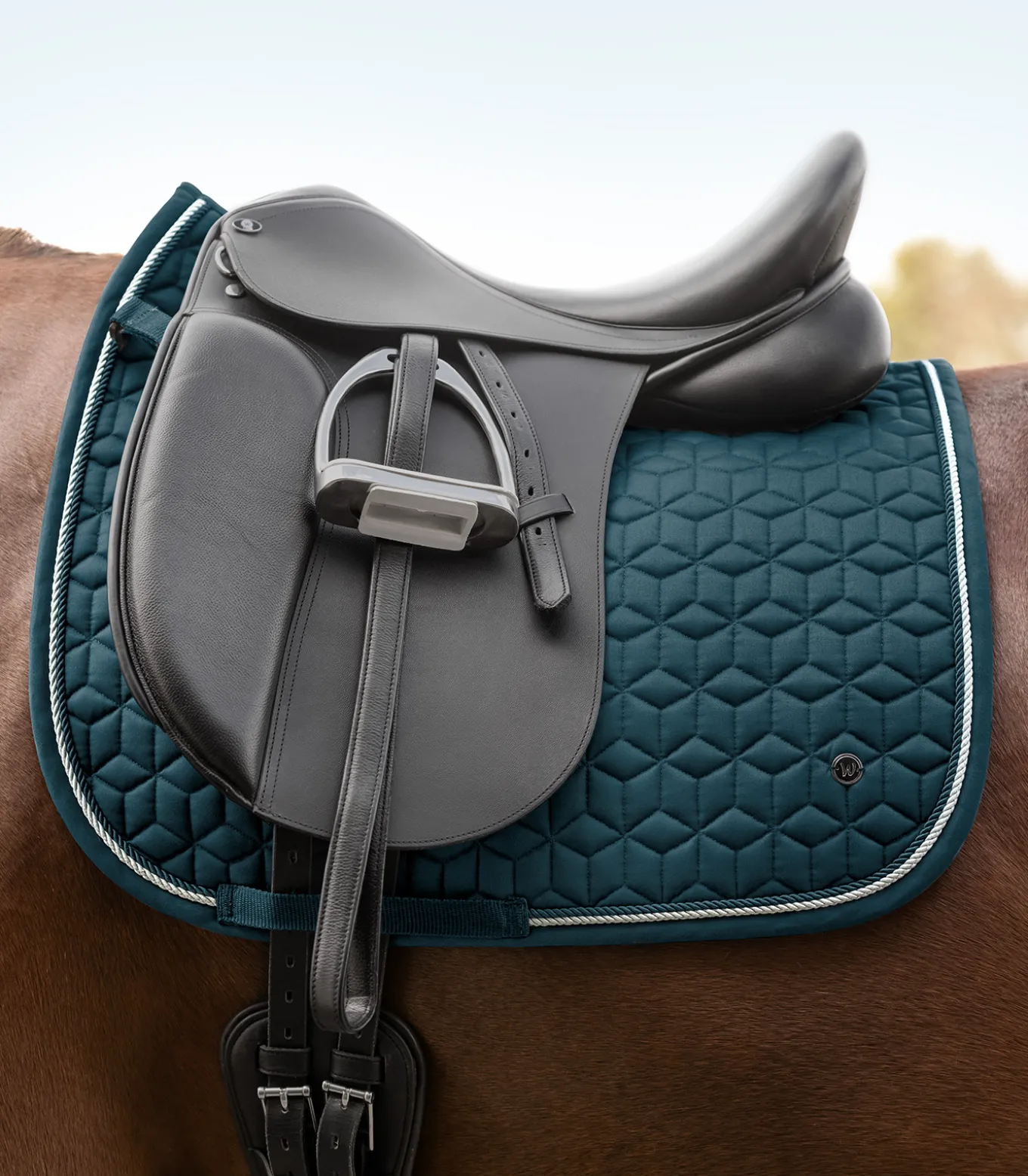 Klassische Schabracke mit formschöner und ausgefallener Steppung. Das Metallplättchen und die zwei Zierkordeln, runden die Schabracke perfekt ab. Die funktionelle Unterseite sorgt für eine optimale Atmungsaktivität. 10 mm Schaum und 200 g/m² Watte gewährleisten beste Druckverteilung. Mit abnehmbaren Klettschlaufen.