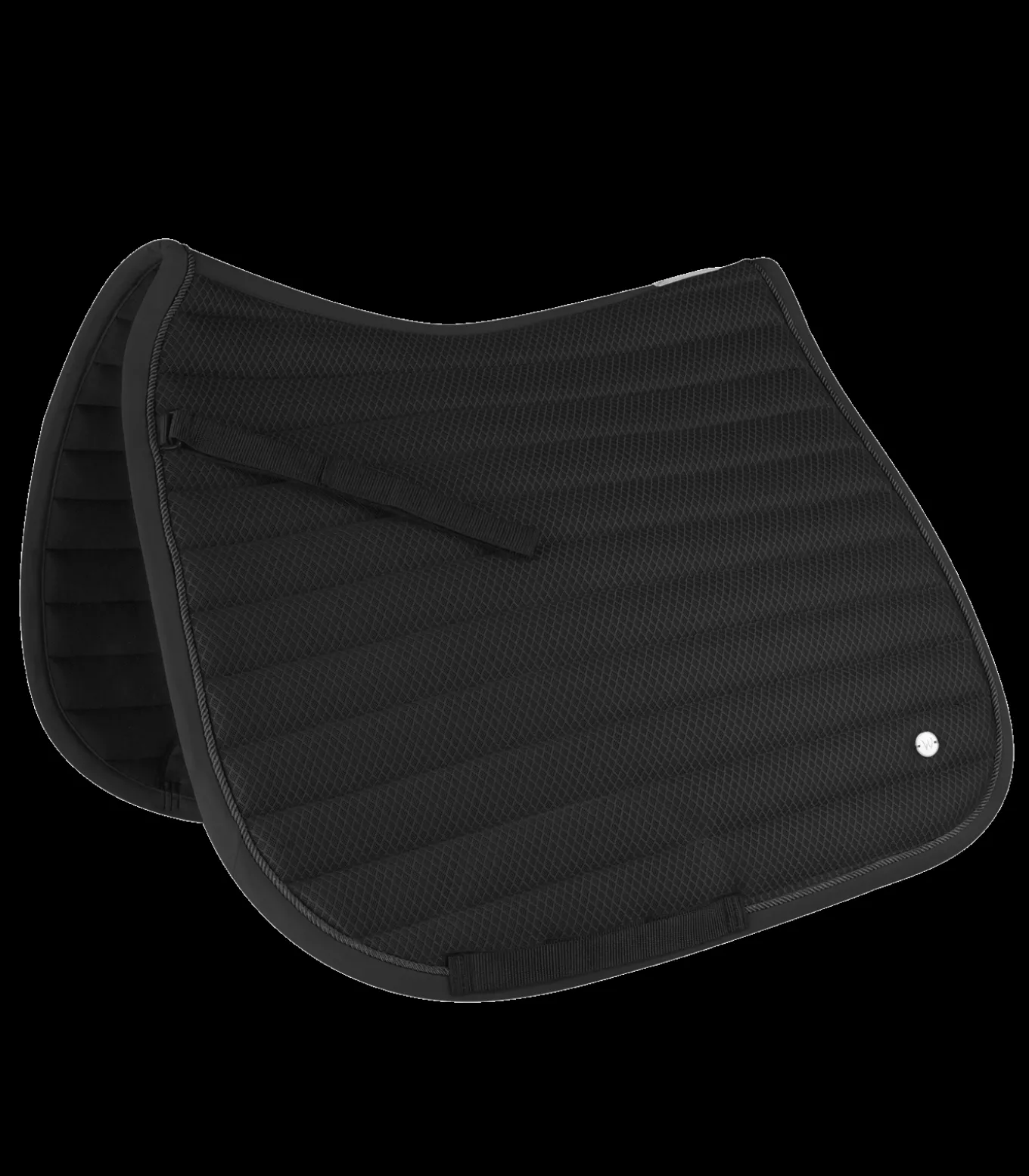 Die Schabracke Rimini bietet durch ihr Mesh Material eine maximale Atmungsaktivität. Abgerundet wird die Schabracke mit einer glitzernden Kordel, sowie einem silbernen Metallplättchen. Es kann zwischen einfachen oder unterteilten Strupfenschlaufen gewählt werden. 10 mm Schaum und 300 g/m² Wattierung gewährleisten beste Druckverteilung. Mit abnehmbaren Klettschlaufen.