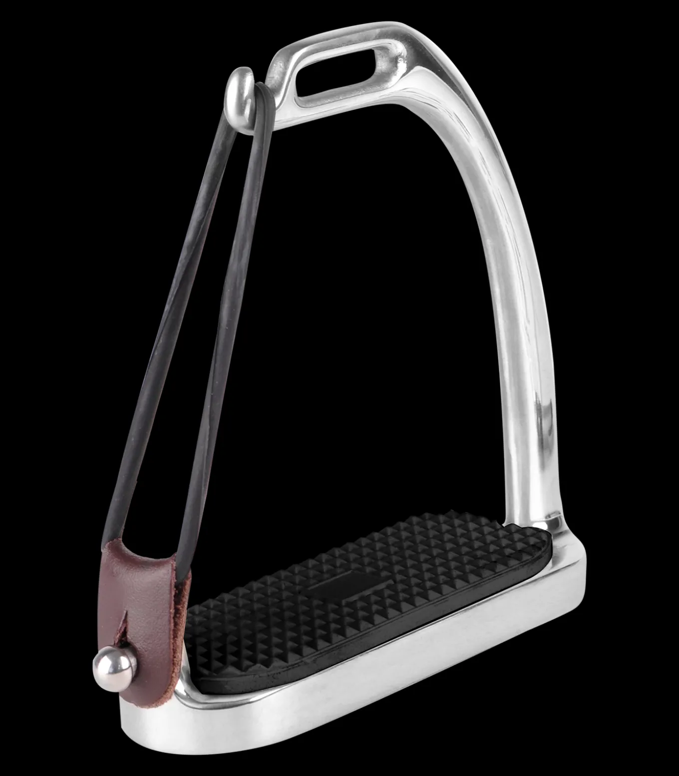 Fillis- Form mit seitlicher Lederschlaufe und Gummiring, damit der Fuß bei Gefahr leichter aus dem Bügel gleiten kann. Edelstahlbügel mit schwarzen Gummieinlagen. Paar