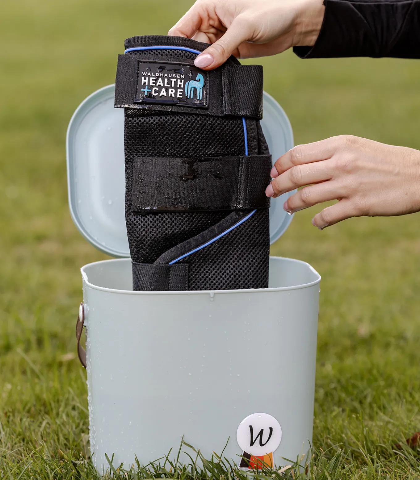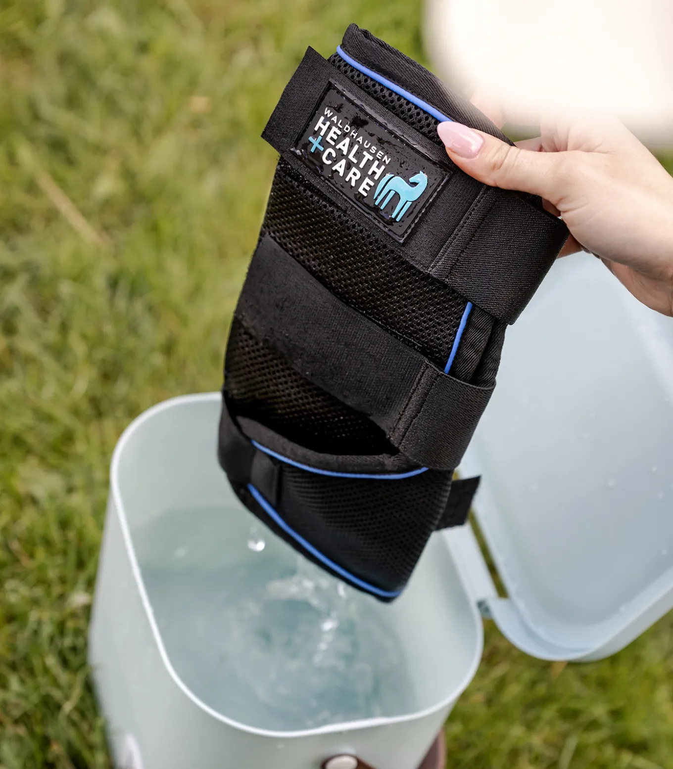 Die Waldhausen Health + Care Ice Layer Gamaschen in einen Wassereimer tauchen, bis sich das Material vollgesogen hat, anschließend auswringen und um das Pferdebein legen. Dank der speziellen Materialien verdunstet das Wasser langsam und entzieht dabei Wärme – für einen angenehmen Kühleffekt. Für eine entspannende Anwendung sollte das Pferd in Ruhe stehen, sich nicht frei bewegen und nicht unbeaufsichtigt sein.