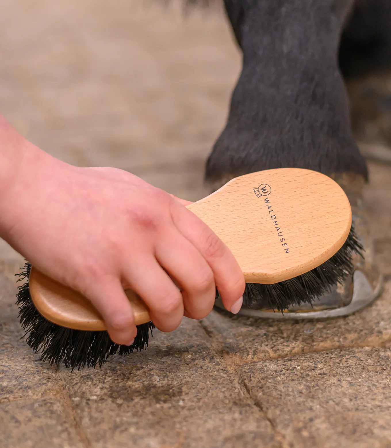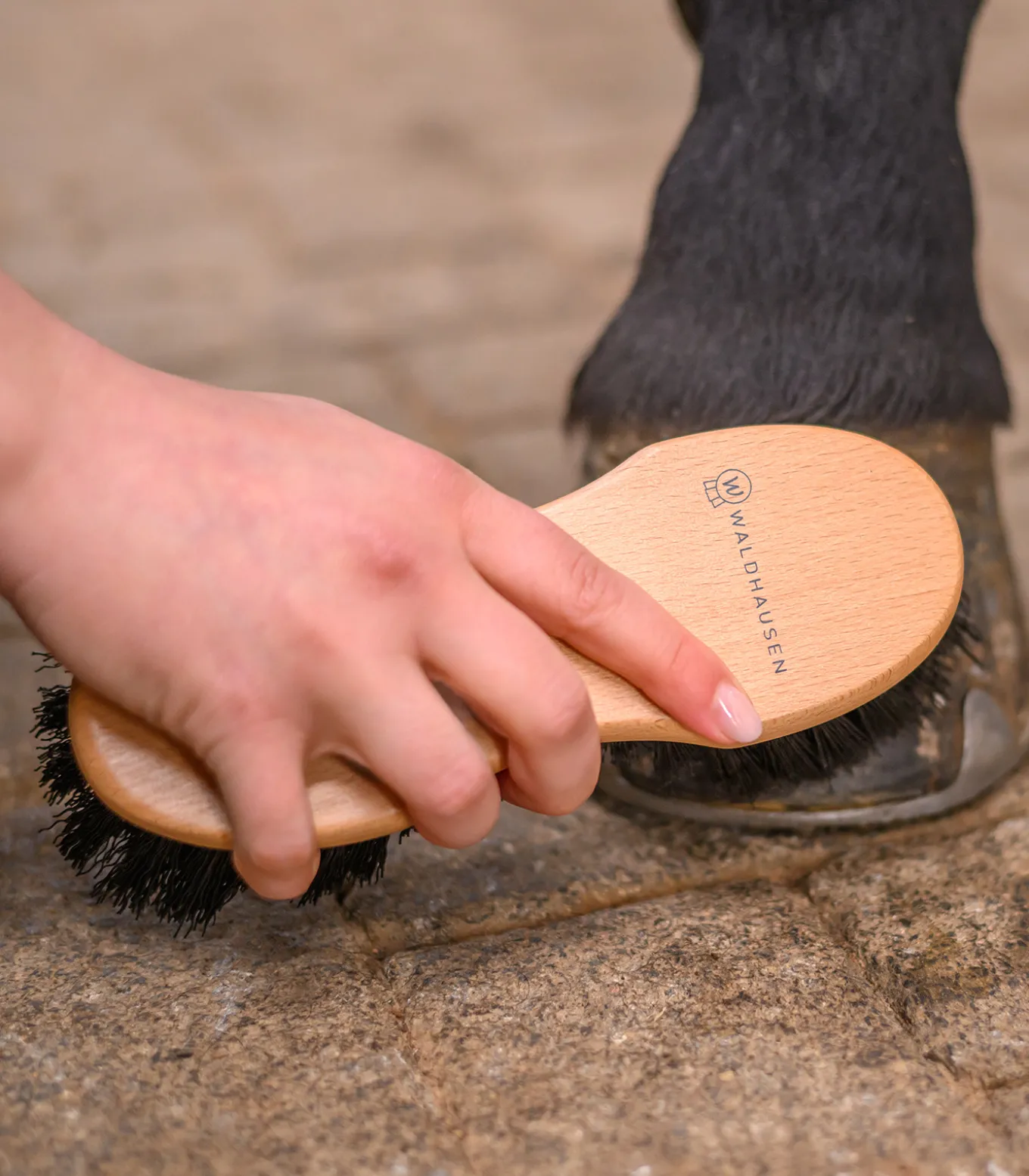 Die unterschiedlich langen Kunststoffborsten ermöglichen müheloses säubern der Pferdehufe. Der Holzrücken liegt angenehm in der Hand.
