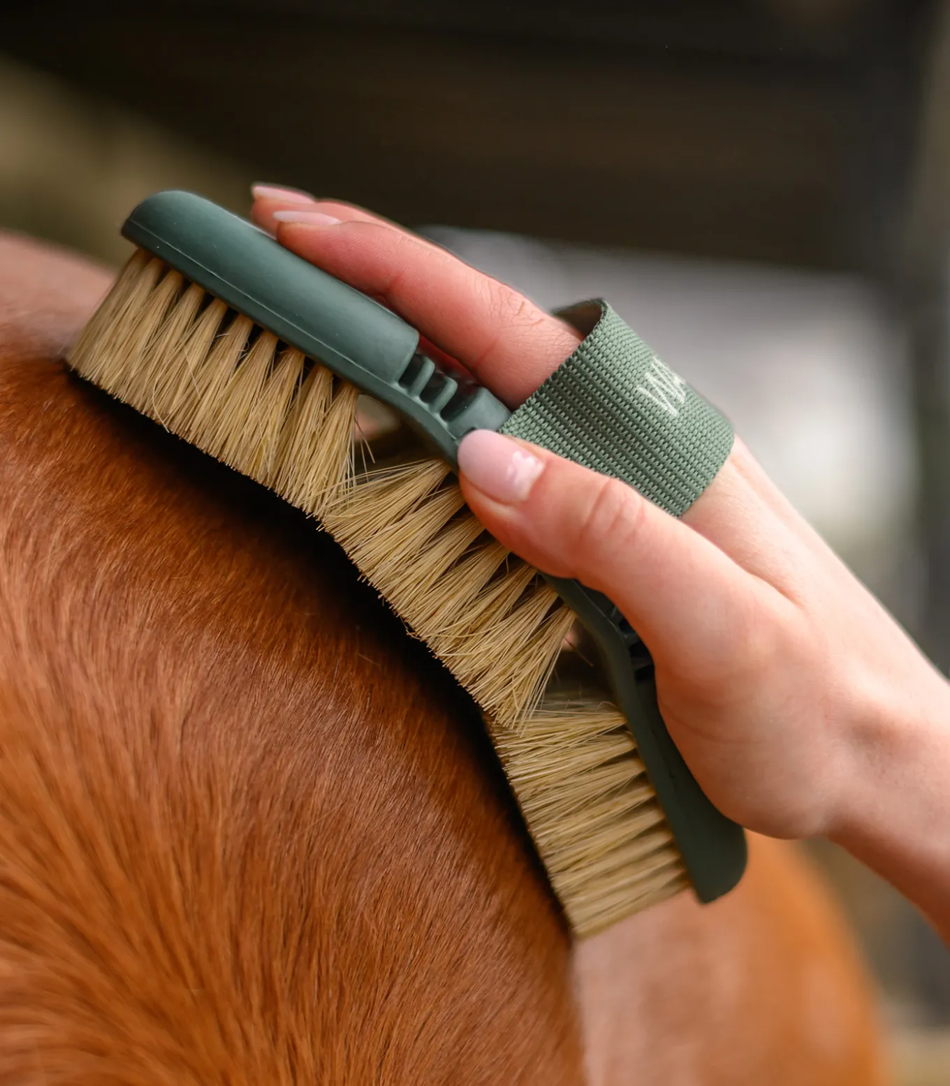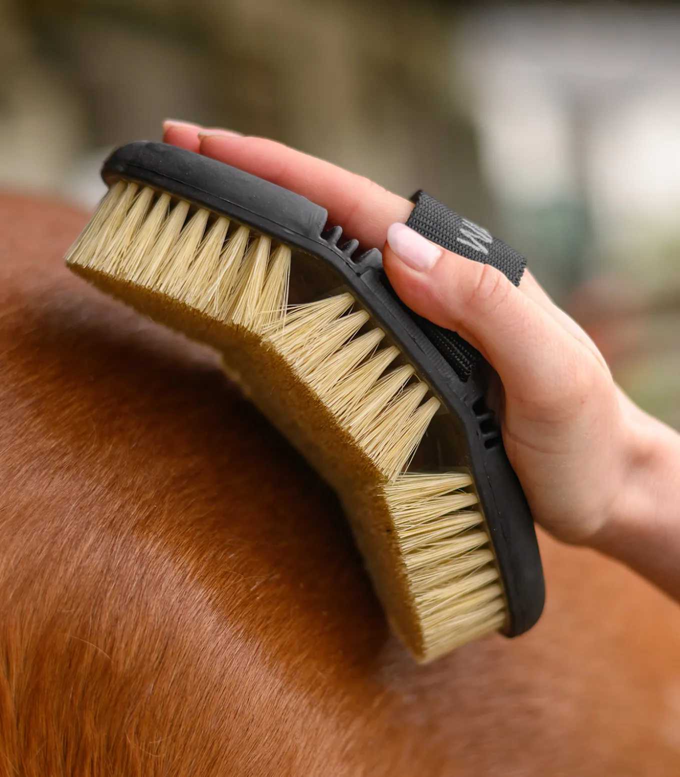 Durch die stabilen Naturborsten ist sie perfekt zum entfernen von festen Verschmutzungen wie Schlamm am ganzen Pferd geeignet.
