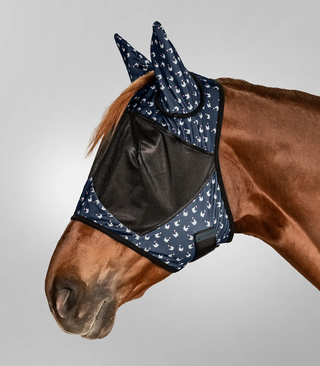 Idealer Schutz vor lästigen Insekten. Optimale Passform durch Elastikeinsätze und einem Klettverschluss. Mit süßem All-Over-Print und weicher Polsterung am Nasenband.