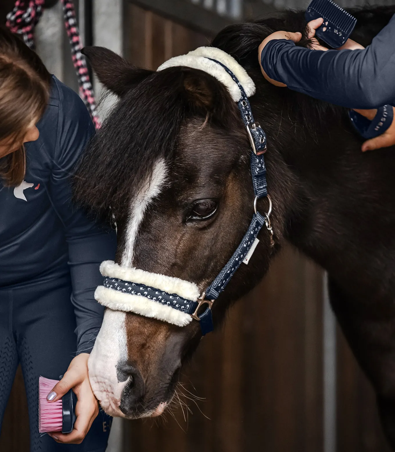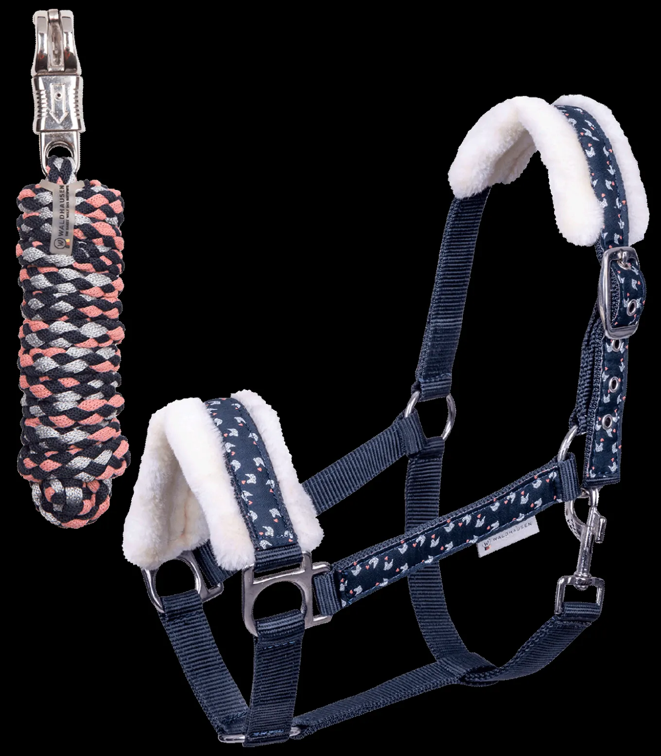 Set bestehend aus Halfter mit süßem All-Over-Print und 3-farbigem Anbindestrick. Das Halfter ist mit Kunst-Fell im Nasen-, und Genickbereich gepolstert. Mehrfach verstellbar am Genick.