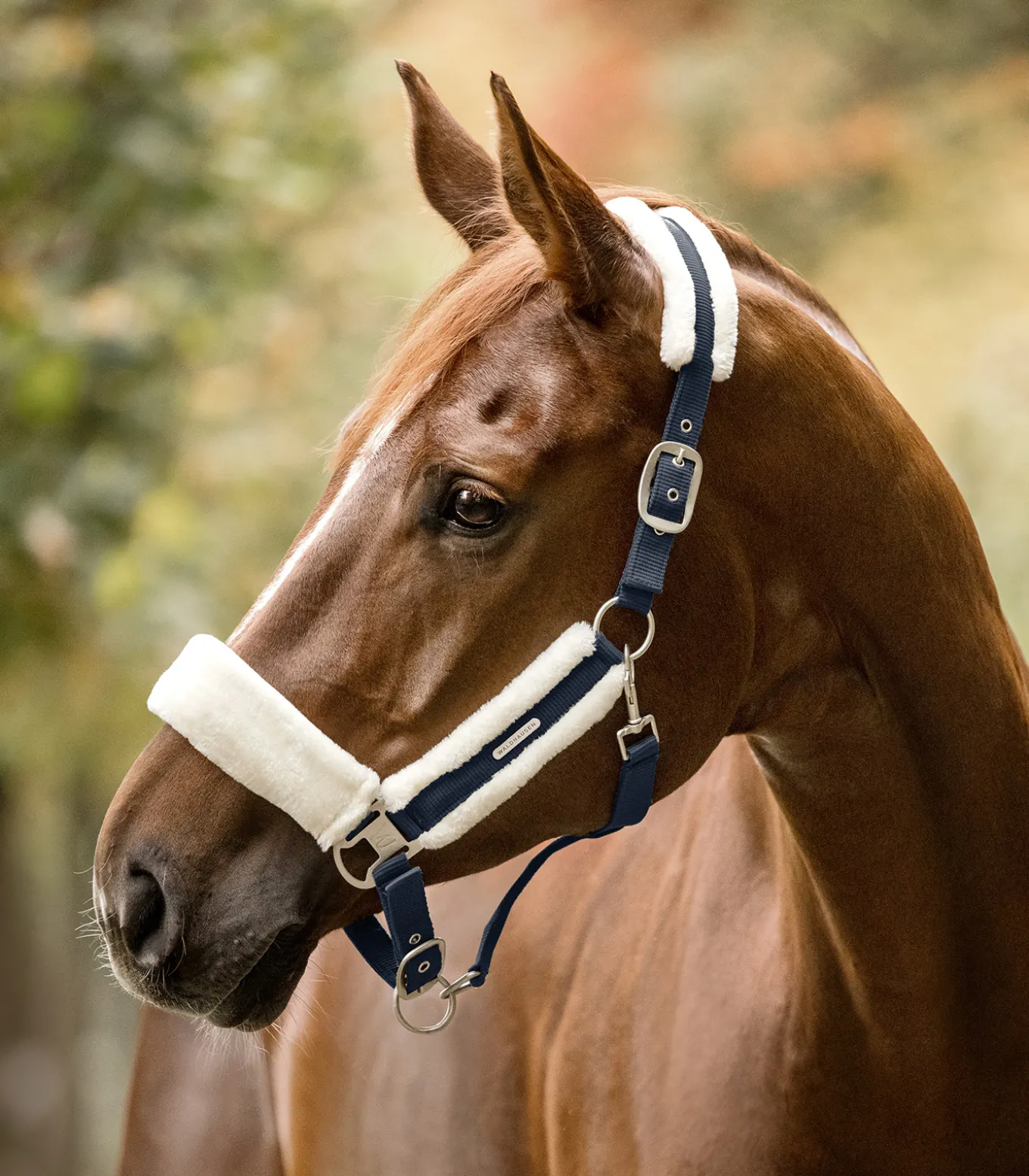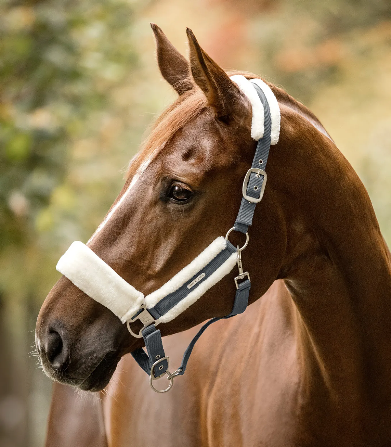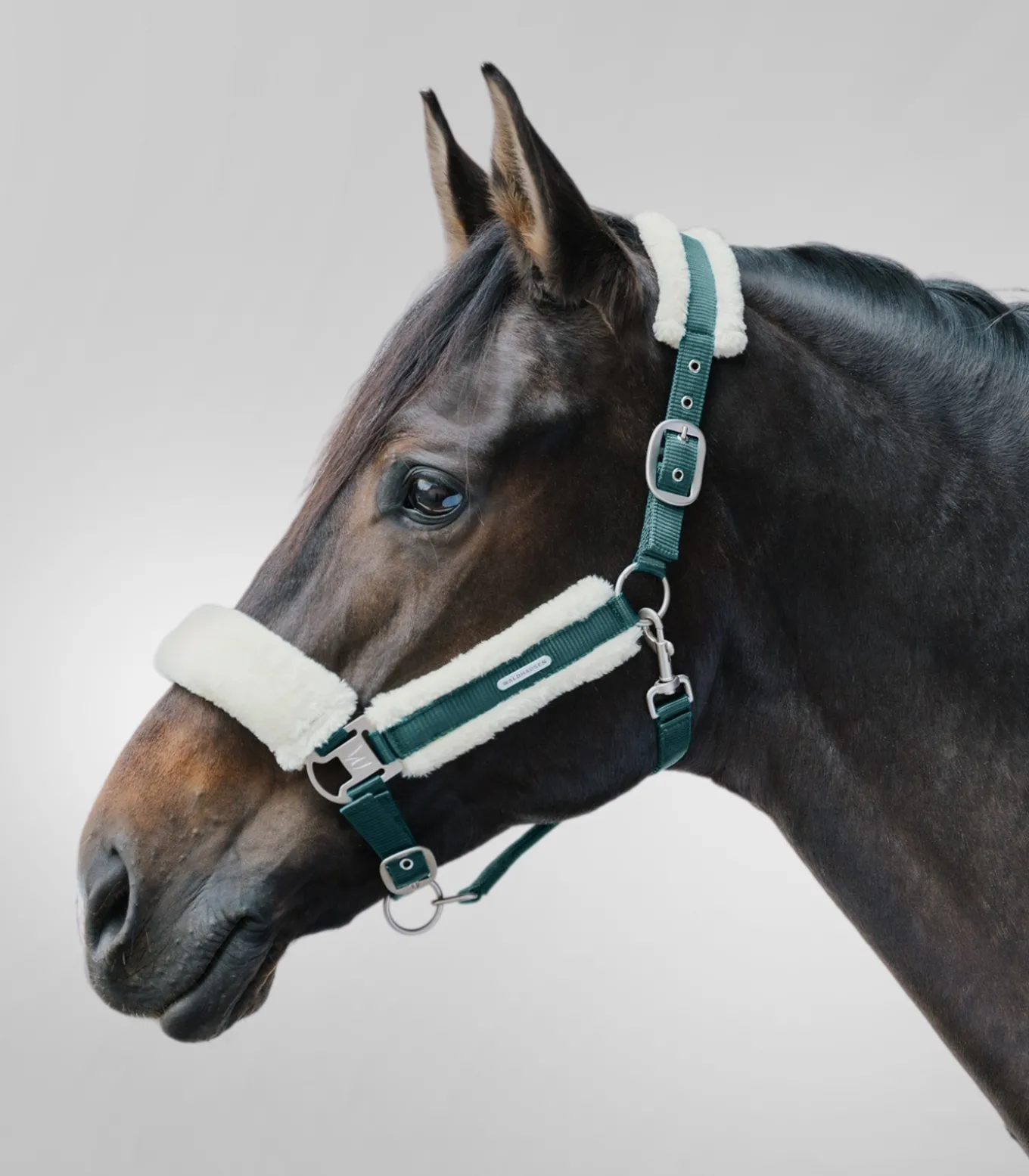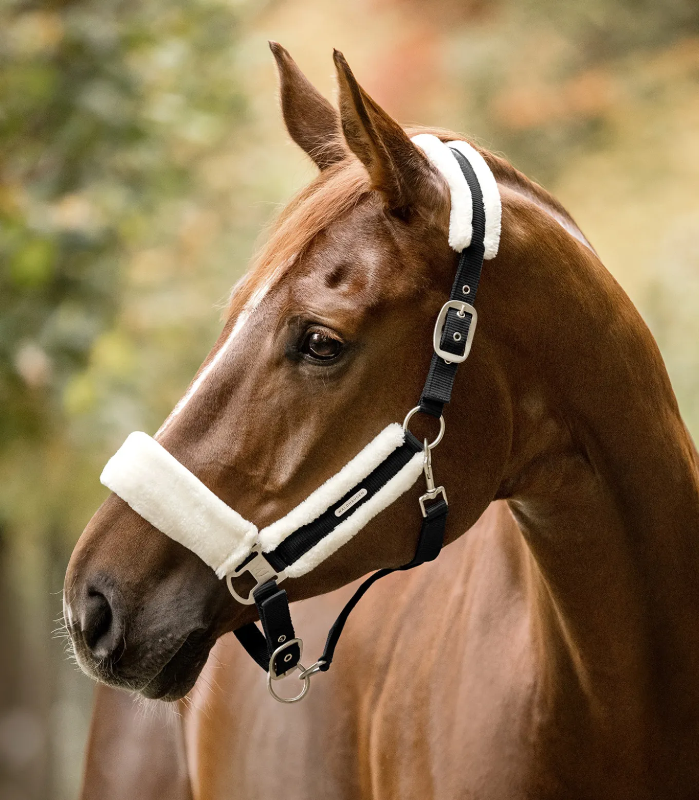 Hochwertiges Halfter mit weicher Polsterung aus synthetischem Fell an Genickstück, Nasenriemen und Backenstücken. Am Kinnriemen einfach und am Genickstück beidseitig verstellbar. Mit matten silbernen Beschlägen und silbernem Waldhausen Logo.