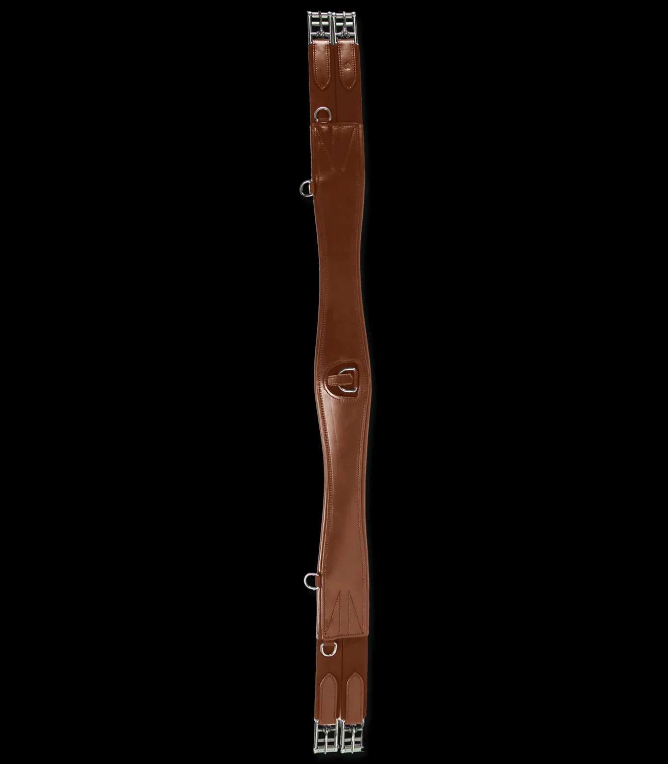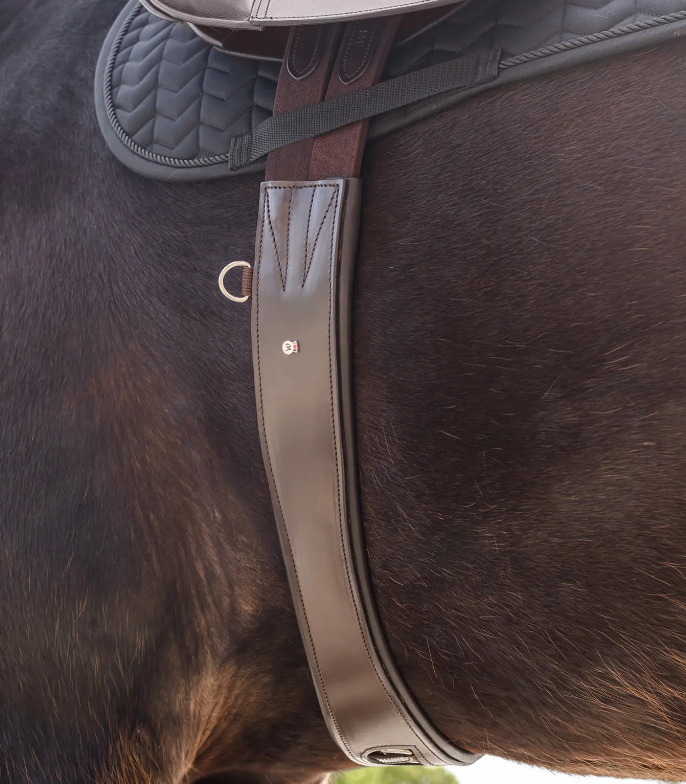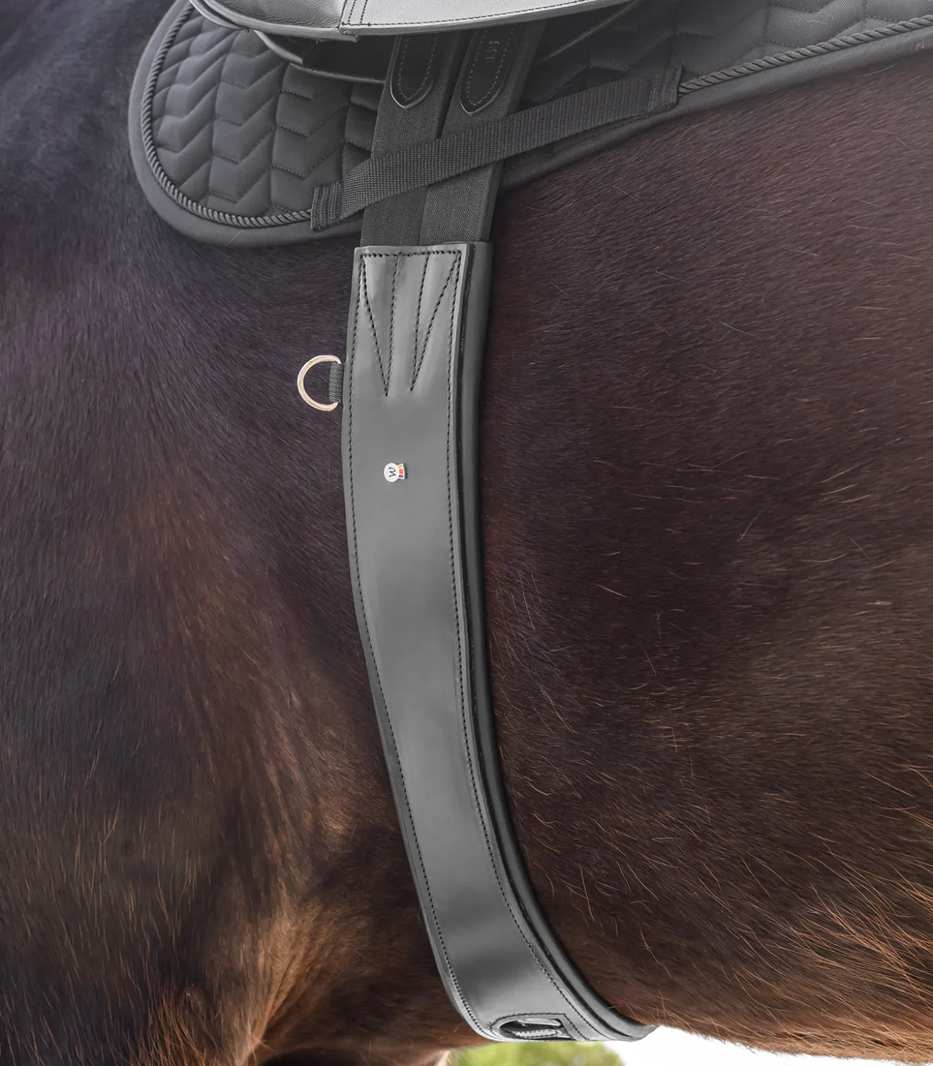 Weich unterlegter Gurt aus qualitativ hochwertigem Leder, strapazierfähig und formbeständig. Mit Edelstahl- Rollschnallen, Elastik-Einsatz an beiden Enden und Ringen für Hilfszügel.