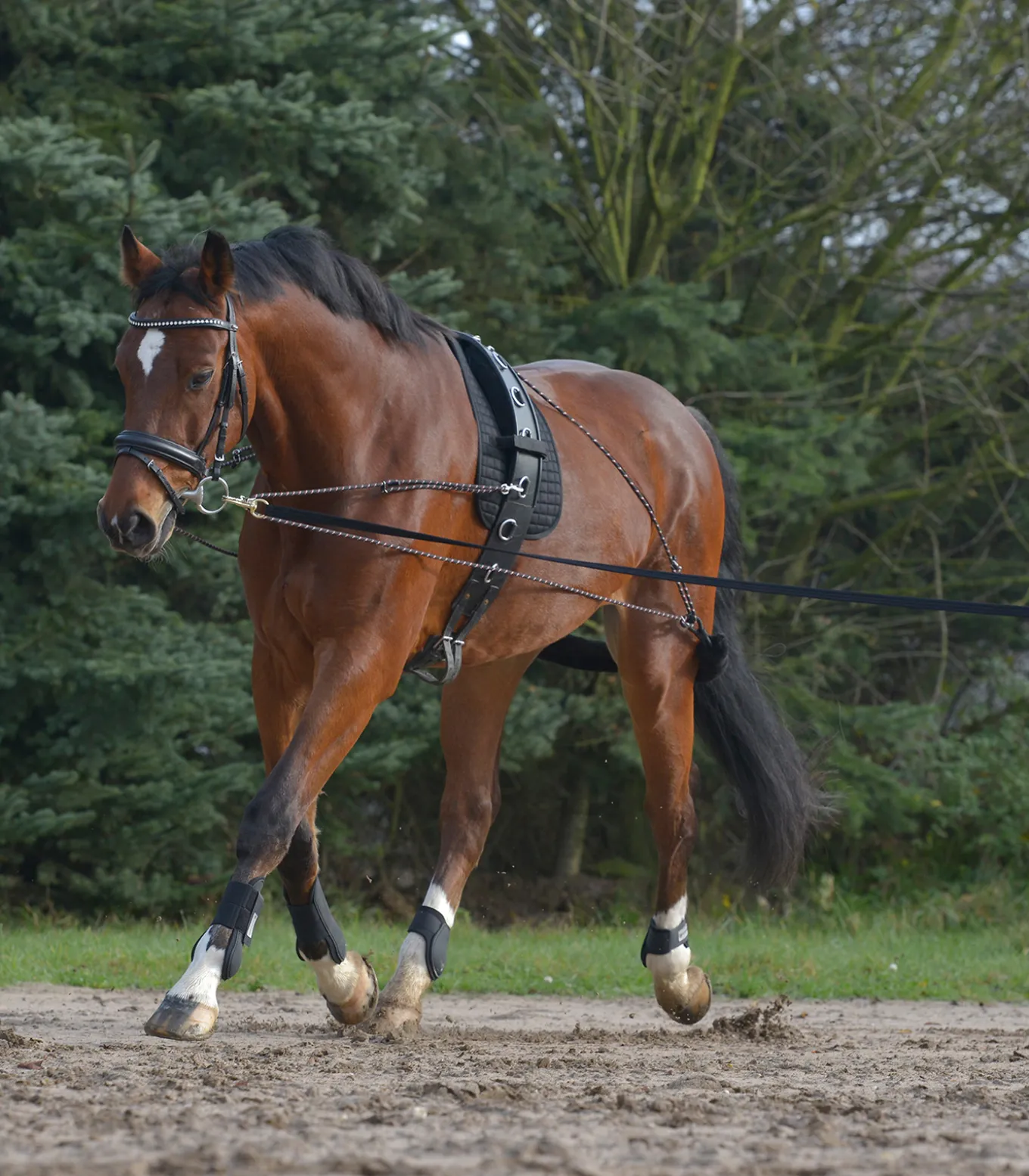 Nutzen Sie die verschiedenen Einstellungsmöglichkeiten je nach Ausbildungsstand ihres Pferdes. Ob Balancearbeit, Vorwärts-Abwärts- oder Dehnungsarbeit, die Hinterhand wird beim Training aktiv mit eingebunden. An der Hinterhand weich abgepolstert. Lieferung ohne Longiergurt und Longe.