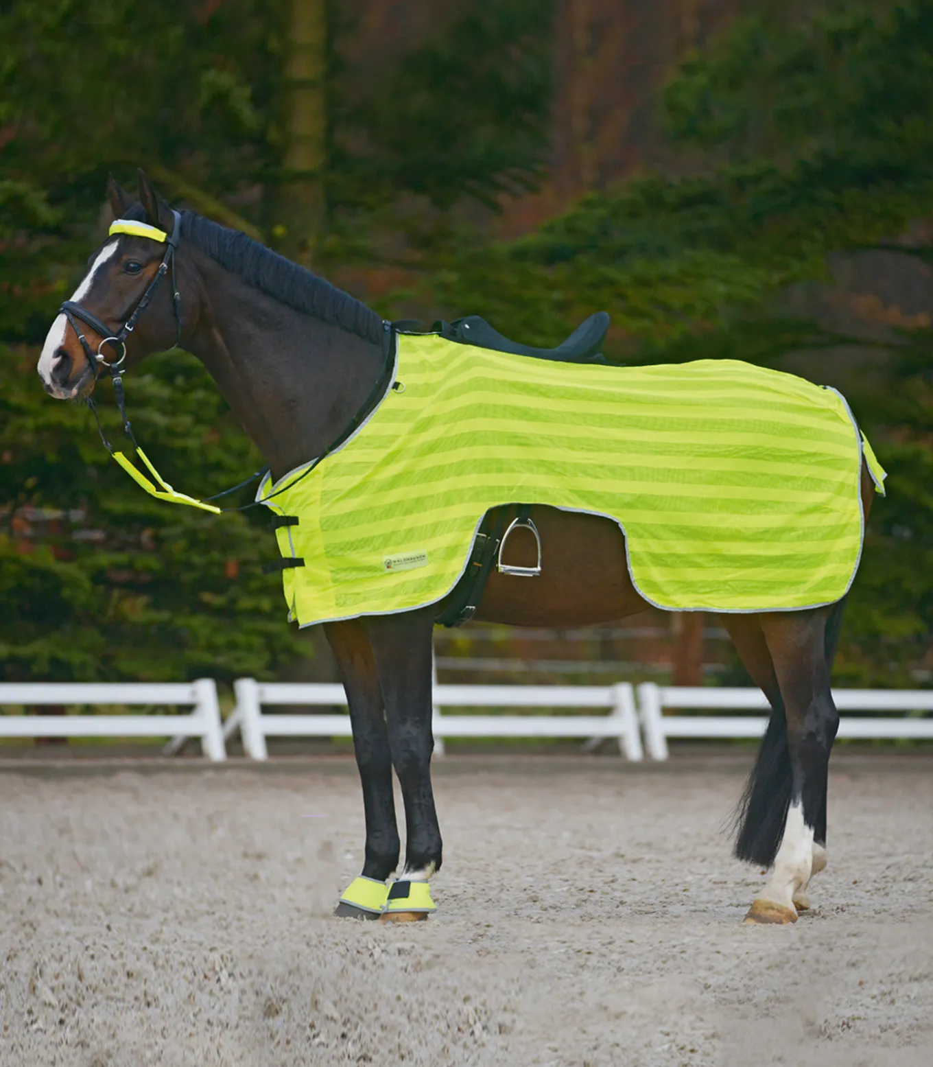 Leichte Ausreitdecke aus stark reflektierendem Netz-Gewebe mit Silber-Leuchtstreifen und rundum reflektierendem Einfaß. Mit Sattelausschnitt und Schweifkordel.