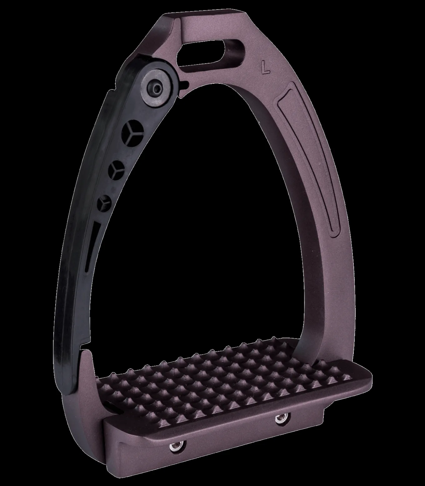 Steigbügel aus hochwertigem Aluminium mit einer 6,5 cm breiten und 12 cm langen Trittfläche. Mit einem Scharnier an der Außenseite. Durch das Reitergewicht öffnet sich das Scharnier im Falle eines Sturzes und verhindert ein Hängenbleiben im Steigbügel. Paar.