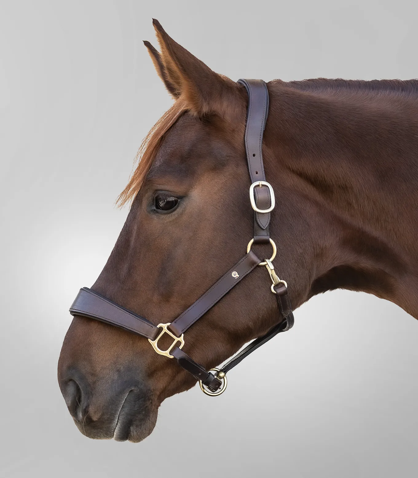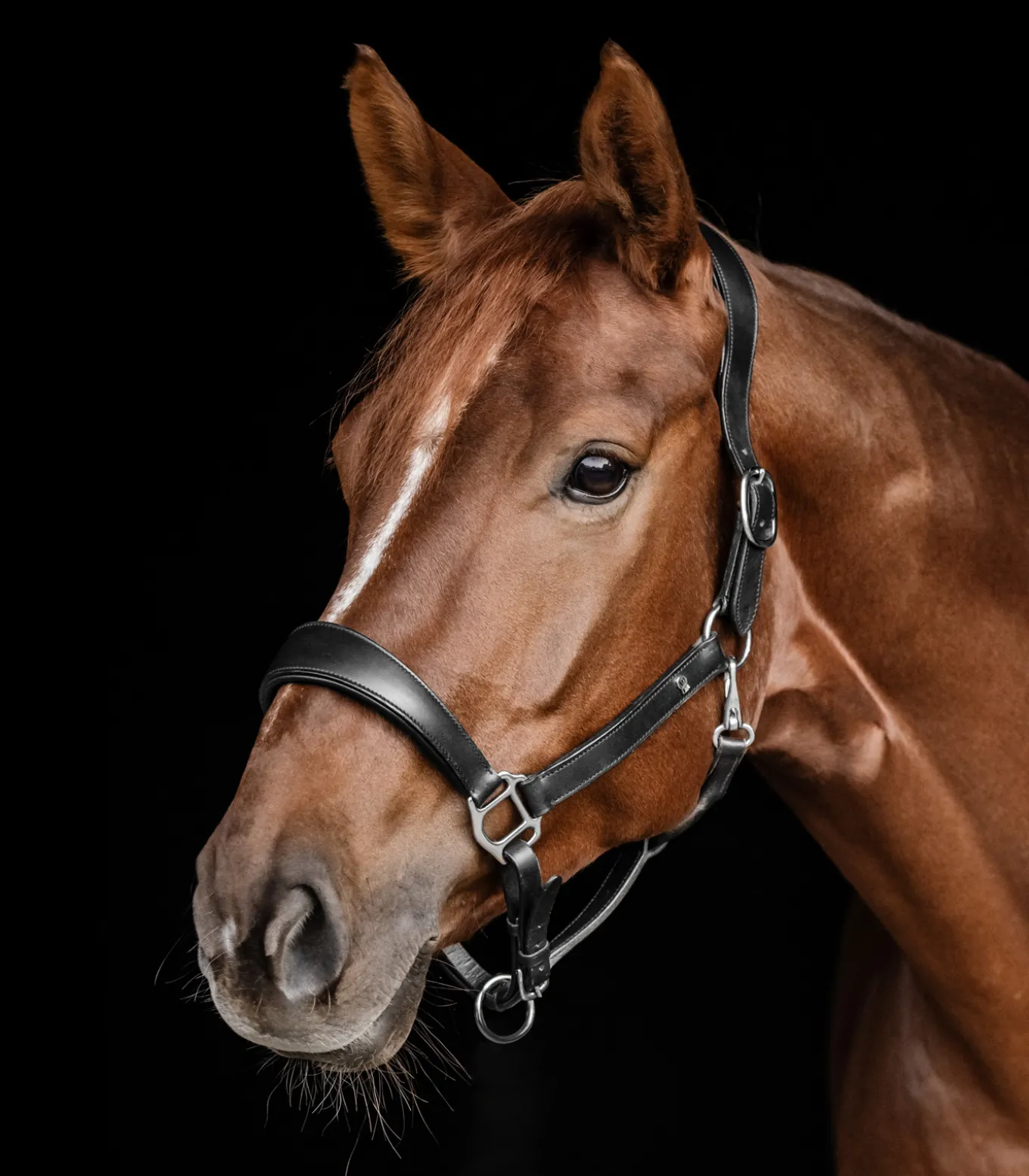 Elegantes Lederhalfter mit anatomisch geformtem Genickstück, beidseitig verstellbar. Weich gepolsterter Nasenriemen und Genickstück sowie rundgenähter Kehlriemen. Hochwertige Beschläge. Einfach verstellbarer Kinnriemen.