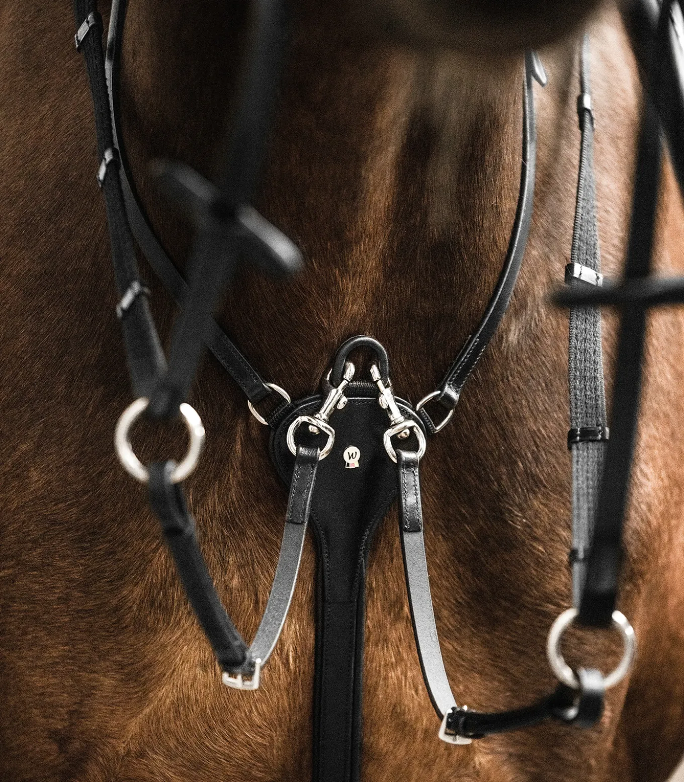 Martingal aus weichem Leder, mit weichem Widerristpolster. Abnehmbare und längenverstellbare Martingalgabel. Mithilfe eines Karabiners einfach am Sattelgurt zu befestigen. Mit Edelstahlschnallen.