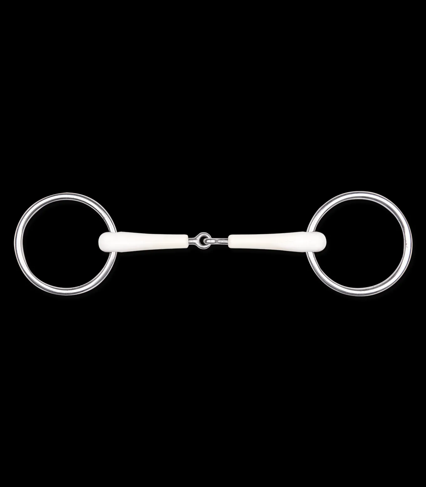 Das hochwertige Thermoplastmaterial ist sehr gut verträglich und regt die Kautätigkeit an. Der Kontakt zum Pferdemaul wird verfeinert und fördert so die Zufriedenheit und Leistungsbereitschaft ihres Pferdes. Die Ringe sind aus Edelstahl, ebenso die im inneren der Gebisse befindlichen Stahlseelen. Achten Sie auf die korrekte Lage des Gebisses damit dieses nicht zerbissen werden kann.