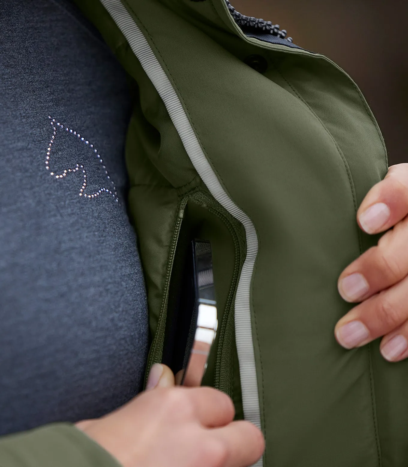 – 2 große, aufgesetzte Taschen mit zusätzlichem, seitlichem Eingriff und handwärmendem Fleecefutter